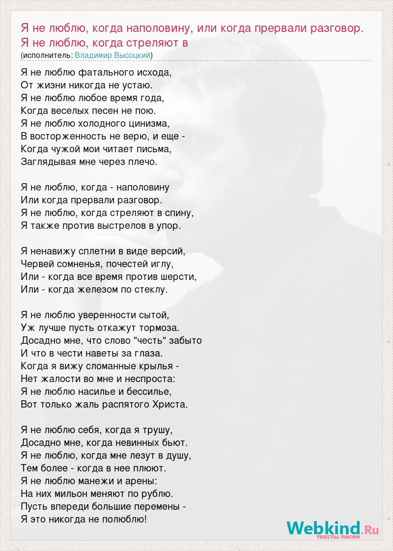 Я не люблю фатального исхода, От жизни никогда не устаю. Я не люблю любое время года, Когда веселых песен не пою. Я не люблю холодного цинизма, В восторженность не верю, и еще - Когда чужой мои читает письма, Заглядывая мне через плечо. Я не люблю, когда - наполовину Или когда прервали разговор. Я не люблю, когда стреляют в спину, Я также против выстрелов в упор. Я ненавижу сплетни в виде версий, Червей сомненья, почестей иглу, Или - когда все время против шерсти, Или - когда железом по стеклу. Я не люблю уверенности сытой, Уж лучше пусть откажут тормоза. Досадно мне, что слово "честь" забыто И что в чести наветы за глаза. Когда я вижу сломанные крылья - Нет жалости во мне и неспроста: Я не люблю насилье и бессилье, Вот только жаль распятого Христа. Я не люблю себя, когда я трушу, Досадно мне, когда невинных бьют. Я не люблю, когда мне лезут в душу, Тем более - когда в нее плюют. Я не люблю манежи и арены: На них мильон меняют по рублю. Пусть впереди большие перемены - Я это никогда не полюблю!