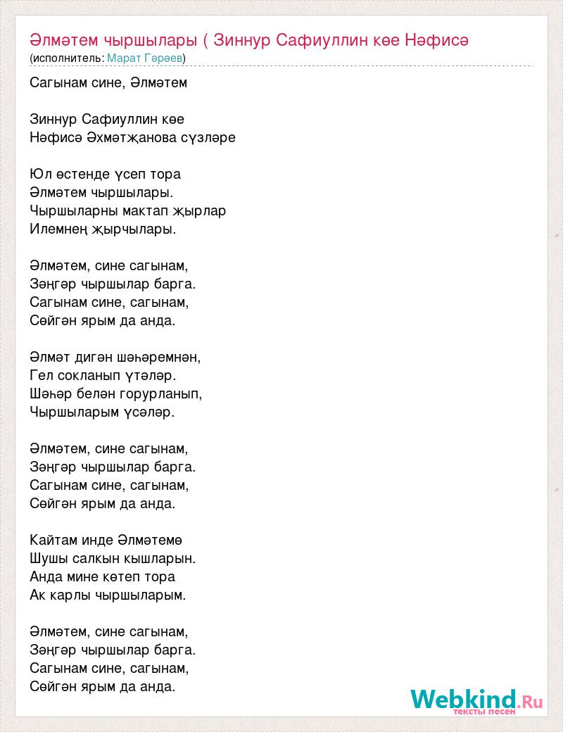 Сагынам сине, Әлмәтем Зиннур Сафиуллин көе Нәфисә Әхмәтҗанова сүзләре Юл өстенде үсеп тора Әлмәтем чыршылары. Чыршыларны мактап җырлар Илемнең җырчылары. Әлмәтем, сине сагынам, Зәңгәр чыршылар барга. Сагынам сине, сагынам, Сөйгән ярым да анда. Әлмәт дигән шәһәремнән, Гел сокланып үтәләр. Шәһәр белән горурланып, Чыршыларым үсәләр. Әлмәтем, сине сагынам, Зәңгәр чыршылар барга. Сагынам сине, сагынам, Сөйгән ярым да анда. Кайтам инде Әлмәтемө Шушы салкын кышларын. Анда мине көтеп тора Ак карлы чыршыларым. Әлмәтем, сине сагынам, Зәңгәр чыршылар барга. Сагынам сине, сагынам, Сөйгән ярым да анда.