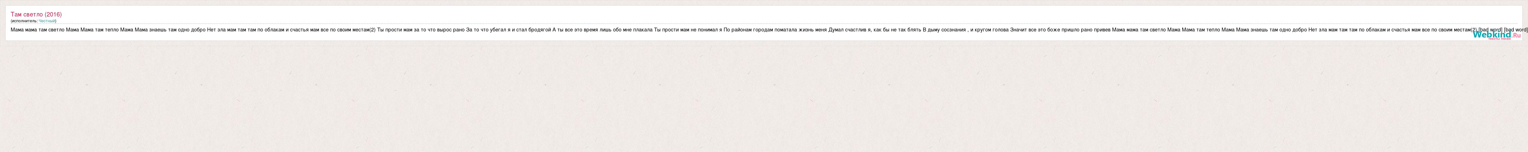 Мама мама там светло Мама Мама там тепло Мама Мама знаешь там одно добро Нет зла мам там там по облакам и счастья мам все по своим местам(2) Ты прости мам за то что вырос рано За то что убегал я и стал бродягой А ты все это время лишь обо мне плакала Ты прости мам не понимал я По районам городам поматала жизнь меня Думал счастлив я, как бы не так блять В дыму сосзнания , и кругом голова Значит все это боже пришло рано привев Мама мама там светло Мама Мама там тепло Мама Мама знаешь там одно добро Нет зла мам там там по облакам и счастья мам все по своим местам(2) [bad word] [bad word]