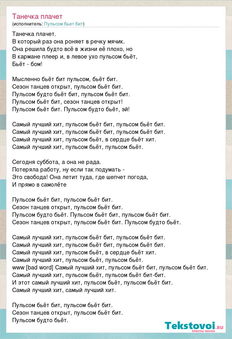 Танечка плачет. В который раз она роняет в речку мячик. Она решила будто всё в жизни её плохо, но В кармане плеер и, в левое ухо пульсом бьёт, Бьёт - бом! Мысленно бьёт бит пульсом, бьёт бит. Сезон танцев открыт, пульсом бьёт бит. Пульсом будто бьёт бит, пульсом бьёт бит. Пульсом бьёт бит, сезон танцев открыт! Пульсом бьёт бит. Пульсом будто бьёт, эй! Самый лучший хит, пульсом бьёт бит, пульсом бьёт бит. Самый лучший хит, пульсом бьёт бит, пульсом бьёт бит. Самый лучший хит, пульсом бьёт, в сердце бьёт хит. Самый лучший хит, пульсом бьёт, пульсом бьёт. Сегодня суббота, а она не рада. Потеряла работу, ну если так подумать - Это свобода! Она летит туда, где шепчет погода, И прямо в самолёте Пульсом бьёт бит, пульсом бьёт бит. Сезон танцев открыт, пульсом бьёт бит. Пульсом будто бьёт. Пульсом бьёт бит, пульсом бьёт бит. Сезон танцев открыт, пульсом бьёт бит. Пульсом будто бьёт. Самый лучший хит, пульсом бьёт бит, пульсом бьёт бит. Самый лучший хит, пульсом бьёт бит, пульсом бьёт бит. Самый лучший хит, пульсом бьёт, в сердце бьёт хит. Самый лучший хит, пульсом бьёт, пульсом бьёт. www [bad word] Самый лучший хит, пульсом бьёт бит, пульсом бьёт бит. Самый лучший хит, пульсом бьёт, пульсом бьёт бит-бит. И этот самый лучший хит, пульсом бьёт, пульсом бьёт бит. Самый лучший хит, самый лучший хит. Пульсом бьёт бит, пульсом бьёт бит. Сезон танцев открыт, пульсом бьёт бит. Пульсом будто бьёт.