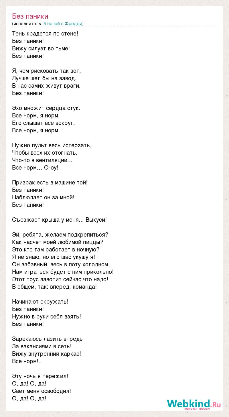 Тень крадется по стене! Без паники! Вижу силуэт во тьме! Без паники! Я, чем рисковать так вот, Лучше шел бы на завод. В нас самих живут враги. Без паники! Эхо множит сердца стук. Все норм, я норм. Его слышат все вокруг. Все норм, я норм. Нужно пульт весь истерзать, Чтобы всех их отогнать. Что-то в вентиляции... Все норм… О-оу! Призрак есть в машине той! Без паники! Наблюдает он за мной! Без паники! Съезжает крыша у меня... Выкуси! Эй, ребята, желаем подкрепиться? Как насчет моей любимой пиццы? Это кто там работает в ночную? Я не знаю, но его щас укушу я! Он забавный, весь в поту холодном. Нам играться будет с ним прикольно! Этот трус завопит сейчас что надо! В общем, так: вперед, команда! Начинают окружать! Без паники! Нужно в руки себя взять! Без паники! Зарекаюсь лазить впредь За вакансиями в сеть! Вижу внутренний каркас! Все норм!.. Эту ночь я пережил! О, да! О, да! Свет меня освободил! О, да! О, да!