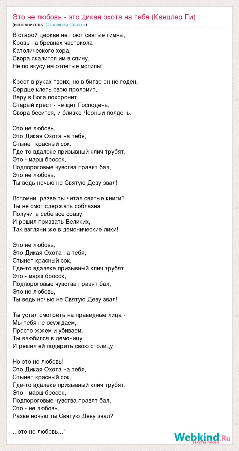 В старой церкви не поют святые гимны, Кровь на бревнах частокола Католического хора, Свора скалится им в спину, Не по вкусу им отпетые могилы! Крест в руках твоих, но в битве он не годен, Сердце клеть свою проломит, Веру в Бога похоронит, Старый крест - не щит Господень, Свора бесится, и близко Черный полдень. Это не любовь, Это Дикая Охота на тебя, Стынет красный сок, Где-то вдалеке призывный клич трубят, Это - марш бросок, Подпороговые чувства правят бал, Это не любовь, Ты ведь ночью не Святую Деву звал! Вспомни, разве ты читал святые книги? Ты не смог сдержать соблазна Получить себе все сразу, И решил призвать Великих, Так взгляни же в демонические лики! Это не любовь, Это Дикая Охота на тебя, Стынет красный сок, Где-то вдалеке призывный клич трубят, Это - марш бросок, Подпороговые чувства правят бал, Это не любовь, Ты ведь ночью не Святую Деву звал! Ты устал смотреть на праведные лица - Мы тебя не осуждаем, Просто жжем и убиваем, Ты влюбился в демоницу И решил ей подарить свою столицу Но это не любовь! Это Дикая Охота на тебя, Стынет красный сок, Где-то вдалеке призывный клич трубят, Это - марш бросок, Подпороговые чувства правят бал, Это - не любовь, Разве ночью ты Святую Деву звал? ...это не любовь..."