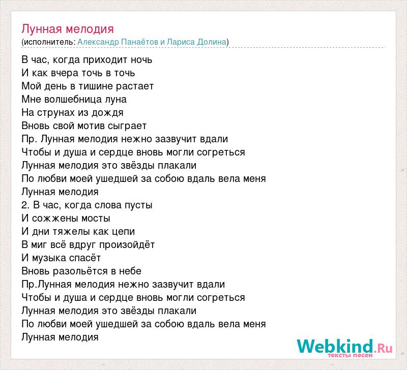 В час, когда приходит ночь И как вчера точь в точь Мой день в тишине растает Мне волшебница луна На струнах из дождя Вновь свой мотив сыграет Пр. Лунная мелодия нежно зазвучит вдали Чтобы и душа и сердце вновь могли согреться Лунная мелодия это звёзды плакали По любви моей ушедшей за собою вдаль вела меня Лунная мелодия 2. В час, когда слова пусты И сожжены мосты И дни тяжелы как цепи В миг всё вдруг произойдёт И музыка спасёт Вновь разольётся в небе Пр.Лунная мелодия нежно зазвучит вдали Чтобы и душа и сердце вновь могли согреться Лунная мелодия это звёзды плакали По любви моей ушедшей за собою вдаль вела меня Лунная мелодия