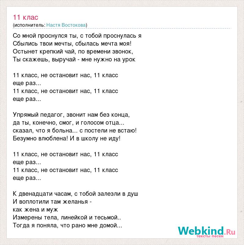 Со мной проснулся ты, с тобой проснулась я Сбылись твои мечты, сбылась мечта моя! Остынет крепкий чай, по времени звонок, Ты скажешь, выручай - мне нужно на урок 11 класс, не остановит нас, 11 класс еще раз... 11 класс, не остановит нас, 11 класс еще раз... Упрямый педагог, звонит нам без конца, да ты, конечно, смог, и голосом отца... сказал, что я больна... с постели не встаю! Безумно влюблена! И в школу не иду! 11 класс, не остановит нас, 11 класс еще раз... 11 класс, не остановит нас, 11 класс еще раз... К двенадцати часам, с тобой залезли в душ И воплотили там желанья - как жена и муж Измерены тела, линейкой и тесьмой.. Тогда я поняла, что рано мне домой...