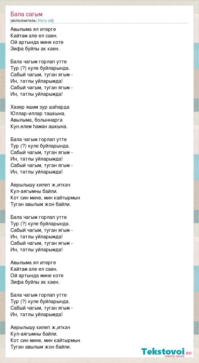Авылыма ял итерге Кайтам але ел саен. Ой артында мине коте Зифа буйлы ак каен. Бала чагым горлап утте Тур (?) куле буйларында. Сабый чагым, туган ягым - Ин, татлы уйларымда! Сабый чагым, туган ягым - Ин, татлы уйларымда! Хазер яшим зур шаhарда Юллар-иллар ташкына. Авылыма, болыннарга Кун.елем hаман ашкына. Бала чагым горлап утте Тур (?) куле буйларында. Сабый чагым, туган ягым - Ин, татлы уйларымда! Сабый чагым, туган ягым - Ин, татлы уйларымда! Аерылышу килеп ж,иткач Кул-аягымны байли. Кот син мине, мин кайтырмын Туган авылым жон байли. Бала чагым горлап утте Тур (?) куле буйларында. Сабый чагым, туган ягым - Ин, татлы уйларымда! Сабый чагым, туган ягым - Ин, татлы уйларымда! Авылыма ял итерге Кайтам але ел саен. Ой артында мине коте Зифа буйлы ак каен. Бала чагым горлап утте Тур (?) куле буйларында. Сабый чагым, туган ягым - Ин, татлы уйларымда! Аерылышу килеп ж,иткач Кул-аягымны байли. Кот син мине, мин кайтырмын Туган авылым жон байли.