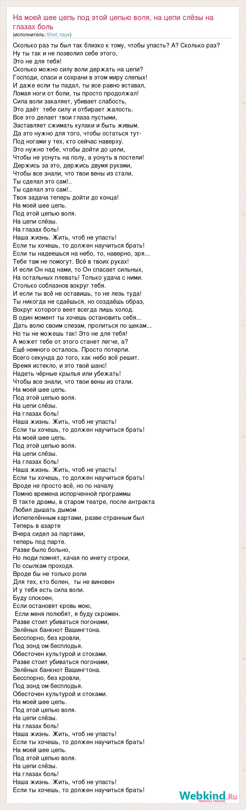 Сколько раз ты был так близко к тому, чтобы упасть? А? Сколько раз? Ну ты так и не позволил себе этого, Это не для тебя! Сколько можно силу воли держать на цепи? Господи, спаси и сохрани в этом миру слепых! И даже если ты падал, ты все равно вставал, Ломая ноги от боли, ты просто продолжал! Сила воли закаляет, убивает слабость, Это даёт тебе силу и отбирает жалость. Все это делает твои глаза пустыми, Заставляет сжимать кулаки и быть живым. Да это нужно для того, чтобы остаться тут- Под ногами у тех, кто сейчас наверху. Это нужно тебе, чтобы дойти до цели, Чтобы не уснуть на полу, а уснуть в постели! Держись за это, держись двумя руками, Чтобы все знали, что твои вены из стали. Ты сделал это сам!.. Ты сделал это сам!.. Твоя задача теперь дойти до конца! На моей шее цепь. Под этой цепью воля. На цепи слёзы. На глазах боль! Наша жизнь. Жить, чтоб не упасть! Если ты хочешь, то должен научиться брать! Если ты надеешься на небо, то, наверно, зря... Тебе там не помогут. Всё в твоих руках! И если Он над нами, то Он спасает сильных, На остальных плевать! Только удача с ними. Столько соблазнов вокруг тебя. И если ты всё не оставишь, то не лезь туда! Ты никогда не сдаёшься, но создаёшь образ, Вокруг которого веет всегда лишь холод. В один момент ты хочешь остановить себя... Дать волю своим слезам, пролиться по щекам... Но ты не можешь так! Это не для тебя! А может тебе от этого станет легче, а? Ещё немного осталось. Просто потерпи. Всего секунда до того, как небо всё решит. Время истекло, и это твой шанс! Надеть чёрные крылья или убежать! Чтобы все знали, что твои вены из стали. На моей шее цепь. Под этой цепью воля. На цепи слёзы. На глазах боль! Наша жизнь. Жить, чтоб не упасть! Если ты хочешь, то должен научиться брать! На моей шее цепь. Под этой цепью воля. На цепи слёзы. На глазах боль! Наша жизнь. Жить, чтоб не упасть! Если ты хочешь, то должен научиться брать! Вроде не просто всё, но по началу Помню времена испорченной программы В такте драмы, в старом театре, после антракта Любил дышать дымом Испепелённым картами, разве странным был Теперь в азарте Вчера сидел за партами, теперь под парте. Разве было больно, Но люди помнят, качая по инету строки, По ссылкам проходя. Вроде бы не только роли Для тех, кто болен, ты не виновен И у тебя есть сила воли. Буду спокоен, Если остановят кровь мою, Если меня полюбят, я буду скромен. Разве стоит убиваться погонами, Зелёных банкнот Вашингтона. Бесспорно, без кровли, Под зонд ом бесплодья. Обесточен культурой и стоками. Разве стоит убиваться погонами, Зелёных банкнот Вашингтона. Бесспорно, без кровли, Под зонд ом бесплодья. Обесточен культурой и стоками. На моей шее цепь. Под этой цепью воля. На цепи слёзы. На глазах боль! Наша жизнь. Жить, чтоб не упасть! Если ты хочешь, то должен научиться брать! На моей шее цепь. Под этой цепью воля. На цепи слёзы. На глазах боль! Наша жизнь. Жить, чтоб не упасть! Если ты хочешь, то должен научиться брать!