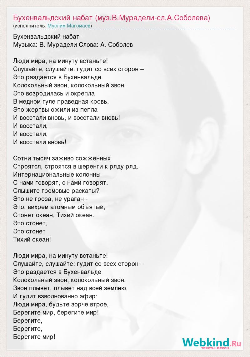 Бухенвальдский набат Музыка: В. Мурадели Слова: А. Соболев Люди мира, на минуту встаньте! Слушайте, слушайте: гудит со всех сторон – Это раздается в Бухенвальде Колокольный звон, колокольный звон. Это возродилась и окрепла В медном гуле праведная кровь. Это жертвы ожили из пепла И восстали вновь, и восстали вновь! И восстали, И восстали, И восстали вновь! Сотни тысяч заживо сожженных Строятся, строятся в шеренги к ряду ряд. Интернациональные колонны С нами говорят, с нами говорят. Слышите громовые раскаты? Это не гроза, не ураган - Это, вихрем атомным объятый, Стонет океан, Тихий океан. Это стонет, Это стонет Тихий океан! Люди мира, на минуту встаньте! Слушайте, слушайте: гудит со всех сторон – Это раздается в Бухенвальде Колокольный звон, колокольный звон. Звон плывет, плывет над всей землею, И гудит взволнованно эфир: Люди мира, будьте зорче втрое, Берегите мир, берегите мир! Берегите, Берегите, Берегите мир!