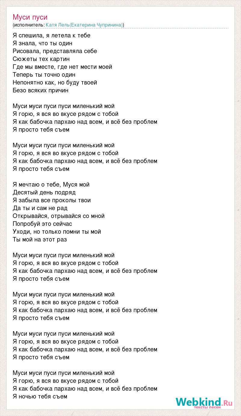 Я спешила, я летела к тебе Я знала, что ты один Рисовала, представляла себе Сюжеты тех картин Где мы вместе, где нет мести моей Теперь ты точно один Непонятно как, но буду твоей Безо всяких причин Муси муси пуси пуси миленький мой Я горю, я вся во вкусе рядом с тобой Я как бабочка пархаю над всем, и всё без проблем Я просто тебя съем Муси муси пуси пуси миленький мой Я горю, я вся во вкусе рядом с тобой Я как бабочка пархаю над всем, и всё без проблем Я просто тебя съем Я мечтаю о тебе, Муся мой Десятый день подряд Я забыла все проколы твои Да ты и сам не рад Открывайся, отрывайся со мной Попробуй это сейчас Уходи, но только помни ты мой Ты мой на этот раз Муси муси пуси пуси миленький мой Я горю, я вся во вкусе рядом с тобой Я как бабочка пархаю над всем, и всё без проблем Я просто тебя съем Муси муси пуси пуси миленький мой Я горю, я вся во вкусе рядом с тобой Я как бабочка пархаю над всем, и всё без проблем Я просто тебя съем Муси муси пуси пуси миленький мой Я горю, я вся во вкусе рядом с тобой Я как бабочка пархаю над всем, и всё без проблем Я просто тебя съем Муси муси пуси пуси миленький мой Я горю, я вся во вкусе рядом с тобой Я как бабочка пархаю над всем, и всё без проблем Я ночью тебя съем