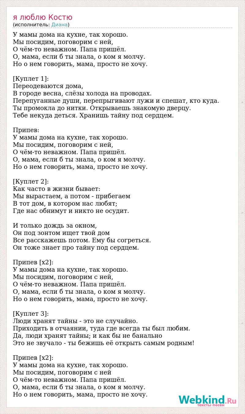 У мамы дома на кухне, так хорошо. Мы посидим, поговорим с ней, О чём-то неважном. Папа пришёл. О, мама, если б ты знала, о ком я молчу. Но о нем говорить, мама, просто не хочу. [Куплет 1]: Переодеваются дома, В городе весна, слёзы холода на проводах. Перепуганные души, перепрыгивают лужи и спешат, кто куда. Ты промокла до нитки. Открываешь знакомую дверцу. Тебе некуда деться. Хранишь тайну под сердцем. Припев: У мамы дома на кухне, так хорошо. Мы посидим, поговорим с ней, О чём-то неважном. Папа пришёл. О, мама, если б ты знала, о ком я молчу. Но о нем говорить, мама, просто не хочу. [Куплет 2]: Как часто в жизни бывает: Мы вырастаем, а потом - прибегаем В тот дом, в котором нас любят; Где нас обнимут и никто не осудит. И только дождь за окном, Он под зонтом ищет твой дом Все расскажешь потом. Ему бы согреться. Он тоже знает про тайну под сердцем. Припев [x2]: У мамы дома на кухне, так хорошо. Мы посидим, поговорим с ней, О чём-то неважном. Папа пришёл. О, мама, если б ты знала, о ком я молчу. Но о нем говорить, мама, просто не хочу. [Куплет 3]: Люди хранят тайны - это не случайно. Приходить в отчаянии, туда где всегда ты был любим. Да, люди хранят тайны; и как бы не банально Это не звучало - ты бежишь её открыть самым родным! Припев [x2]: У мамы дома на кухне, так хорошо. Мы посидим, поговорим с ней О чём-то неважном. Папа пришёл. О, мама, если б ты знала, о ком я молчу. Но о нем говорить, мама, просто не хочу.