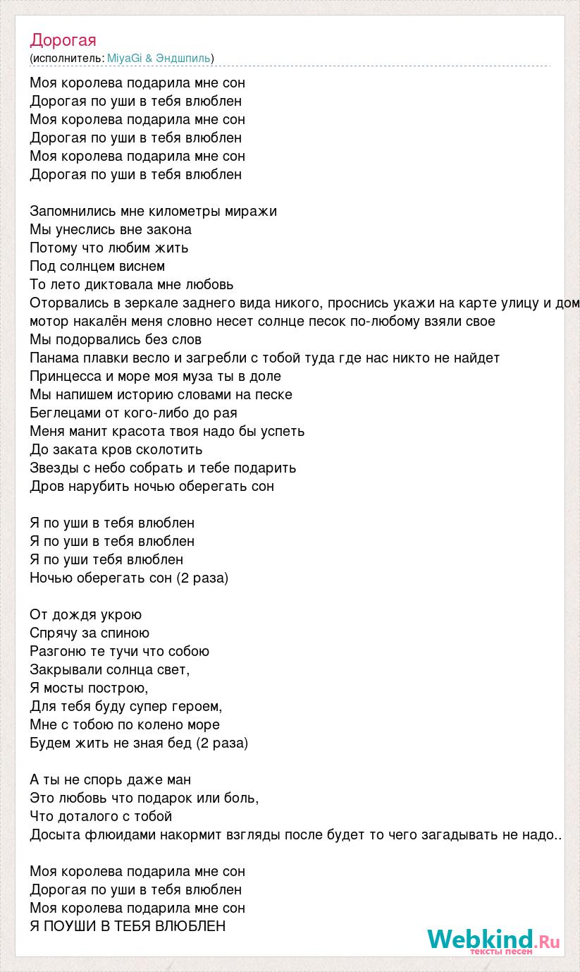 Моя королева подарила мне сон Дорогая по уши в тебя влюблен Моя королева подарила мне сон Дорогая по уши в тебя влюблен Моя королева подарила мне сон Дорогая по уши в тебя влюблен Запомнились мне километры миражи Мы унеслись вне закона Потому что любим жить Под солнцем виснем То лето диктовала мне любовь Оторвались в зеркале заднего вида никого, проснись укажи на карте улицу и дом мотор накалён меня словно несет солнце песок по-любому взяли свое Мы подорвались без слов Панама плавки весло и загребли с тобой туда где нас никто не найдет Принцесса и море моя муза ты в доле Мы напишем историю словами на песке Беглецами от кого-либо до рая Меня манит красота твоя надо бы успеть До заката кров сколотить Звезды с небо собрать и тебе подарить Дров нарубить ночью оберегать сон Я по уши в тебя влюблен Я по уши в тебя влюблен Я по уши тебя влюблен Ночью оберегать сон (2 раза) От дождя укрою Спрячу за спиною Разгоню те тучи что собою Закрывали солнца свет, Я мосты построю, Для тебя буду супер героем, Мне с тобою по колено море Будем жить не зная бед (2 раза) А ты не спорь даже ман Это любовь что подарок или боль, Что доталого с тобой Досыта флюидами накормит взгляды после будет то чего загадывать не надо.. Моя королева подарила мне сон Дорогая по уши в тебя влюблен Моя королева подарила мне сон Я ПОУШИ В ТЕБЯ ВЛЮБЛЕН