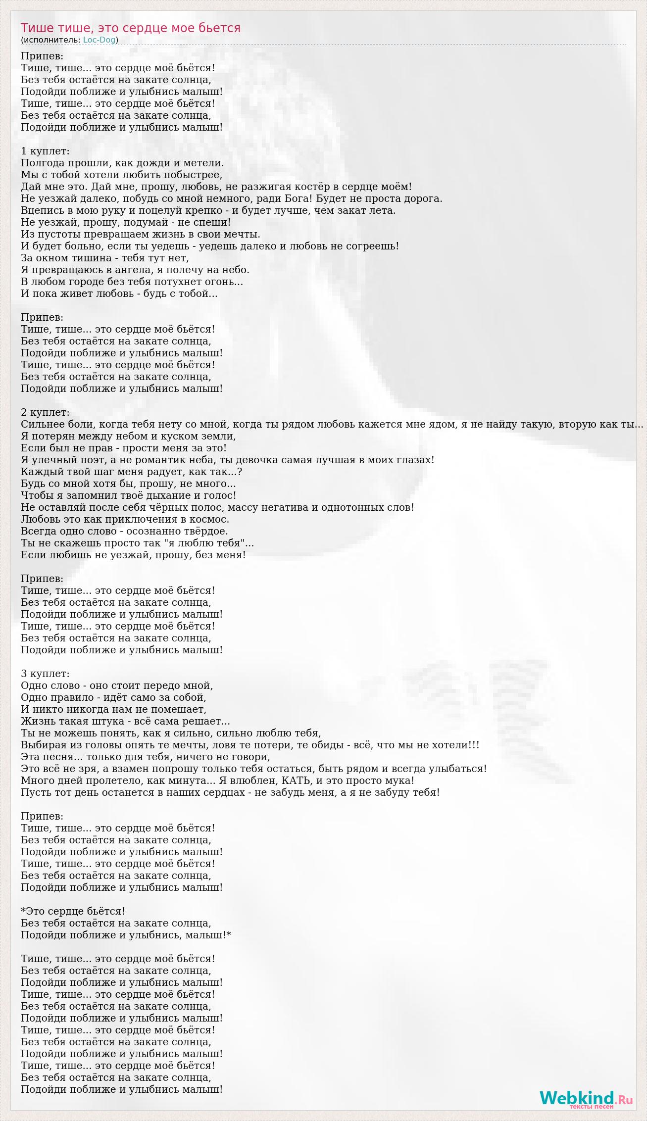 Припев: Тише, тише... это сердце моё бьётся! Без тебя остаётся на закате солнца, Подойди поближе и улыбнись малыш! Тише, тише... это сердце моё бьётся! Без тебя остаётся на закате солнца, Подойди поближе и улыбнись малыш! 1 куплет: Полгода прошли, как дожди и метели. Мы с тобой хотели любить побыстрее, Дай мне это. Дай мне, прошу, любовь, не разжигая костёр в сердце моём! Не уезжай далеко, побудь со мной немного, ради Бога! Будет не проста дорога. Вцепись в мою руку и поцелуй крепко - и будет лучше, чем закат лета. Не уезжай, прошу, подумай - не спеши! Из пустоты превращаем жизнь в свои мечты. И будет больно, если ты уедешь - уедешь далеко и любовь не согреешь! За окном тишина - тебя тут нет, Я превращаюсь в ангела, я полечу на небо. В любом городе без тебя потухнет огонь... И пока живет любовь - будь с тобой... Припев: Тише, тише... это сердце моё бьётся! Без тебя остаётся на закате солнца, Подойди поближе и улыбнись малыш! Тише, тише... это сердце моё бьётся! Без тебя остаётся на закате солнца, Подойди поближе и улыбнись малыш! 2 куплет: Сильнее боли, когда тебя нету со мной, когда ты рядом любовь кажется мне ядом, я не найду такую, вторую как ты... Я потерян между небом и куском земли, Если был не прав - прости меня за это! Я улечный поэт, а не романтик неба, ты девочка самая лучшая в моих глазах! Каждый твой шаг меня радует, как так...? Будь со мной хотя бы, прошу, не много... Чтобы я запомнил твоё дыхание и голос! Не оставляй после себя чёрных полос, массу негатива и однотонных слов! Любовь это как приключения в космос. Всегда одно слово - осознанно твёрдое. Ты не скажешь просто так "я люблю тебя"... Если любишь не уезжай, прошу, без меня! Припев: Тише, тише... это сердце моё бьётся! Без тебя остаётся на закате солнца, Подойди поближе и улыбнись малыш! Тише, тише... это сердце моё бьётся! Без тебя остаётся на закате солнца, Подойди поближе и улыбнись малыш! 3 куплет: Одно слово - оно стоит передо мной, Одно правило - идёт само за собой, И никто никогда нам не помешает, Жизнь такая штука - всё сама решает... Ты не можешь понять, как я сильно, сильно люблю тебя, Выбирая из головы опять те мечты, ловя те потери, те обиды - всё, что мы не хотели!!! Эта песня... только для тебя, ничего не говори, Это всё не зря, а взамен попрошу только тебя остаться, быть рядом и всегда улыбаться! Много дней пролетело, как минута... Я влюблен, КАТЬ, и это просто мука! Пусть тот день останется в наших сердцах - не забудь меня, а я не забуду тебя! Припев: Тише, тише... это сердце моё бьётся! Без тебя остаётся на закате солнца, Подойди поближе и улыбнись малыш! Тише, тише... это сердце моё бьётся! Без тебя остаётся на закате солнца, Подойди поближе и улыбнись малыш! *Это сердце бьётся! Без тебя остаётся на закате солнца, Подойди поближе и улыбнись, малыш!* Тише, тише... это сердце моё бьётся! Без тебя остаётся на закате солнца, Подойди поближе и улыбнись малыш! Тише, тише... это сердце моё бьётся! Без тебя остаётся на закате солнца, Подойди поближе и улыбнись малыш! Тише, тише... это сердце моё бьётся! Без тебя остаётся на закате солнца, Подойди поближе и улыбнись малыш! Тише, тише... это сердце моё бьётся! Без тебя остаётся на закате солнца, Подойди поближе и улыбнись малыш!