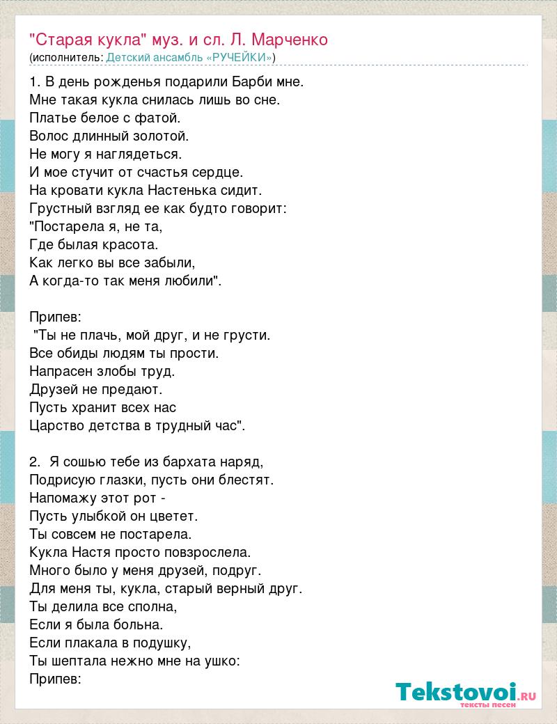 1. В день рожденья подарили Барби мне. Мне такая кукла снилась лишь во сне. Платье белое с фатой. Волос длинный золотой. Не могу я наглядеться. И мое стучит от счастья сердце. На кровати кукла Настенька сидит. Грустный взгляд ее как будто говорит: "Постарела я, не та, Где былая красота. Как легко вы все забыли, А когда-то так меня любили". Припев: "Ты не плачь, мой друг, и не грусти. Все обиды людям ты прости. Напрасен злобы труд. Друзей не предают. Пусть хранит всех нас Царство детства в трудный час". 2. Я сошью тебе из бархата наряд, Подрисую глазки, пусть они блестят. Напомажу этот рот - Пусть улыбкой он цветет. Ты совсем не постарела. Кукла Настя просто повзрослела. Много было у меня друзей, подруг. Для меня ты, кукла, старый верный друг. Ты делила все сполна, Если я была больна. Если плакала в подушку, Ты шептала нежно мне на ушко: Припев: