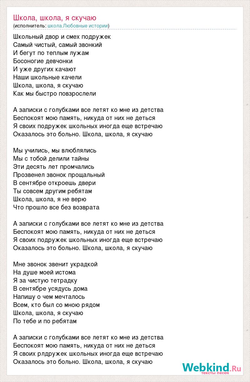 Школьный двор и смех подружек Самый чистый, самый звонкий И бегут по теплым лужам Босоногие девчонки И уже других качают Наши школьные качели Школа, школа, я скучаю Как мы быстро повзрослели А записки с голубками все летят ко мне из детства Беспокоят мою память, никуда от них не деться Я своих подружек школьных иногда еще встречаю Оказалось это больно. Школа, школа, я скучаю Мы учились, мы влюблялись Мы с тобой делили тайны Эти десять лет промчались Прозвенел звонок прощальный В сентябре откроешь двери Ты совсем другим ребятам Школа, школа, я не верю Что прошло все без возврата А записки с голубками все летят ко мне из детства Беспокоят мою память, никуда от них не деться Я своих подружек школьных иногда еще встречаю Оказалось это больно. Школа, школа, я скучаю Мне звонок звенит украдкой На душе моей истома Я за чистую тетрадку В сентябре усядусь дома Напишу о чем мечталось Всем, кто был со мною рядом Школа, школа, я скучаю По тебе и по ребятам А записки с голубками все летят ко мне из детства Беспокоят мою память, никуда от них не деться Я своих рлдружек школьных иногда еще встречаю Оказалось это больно. Школа, школа, я скучаю