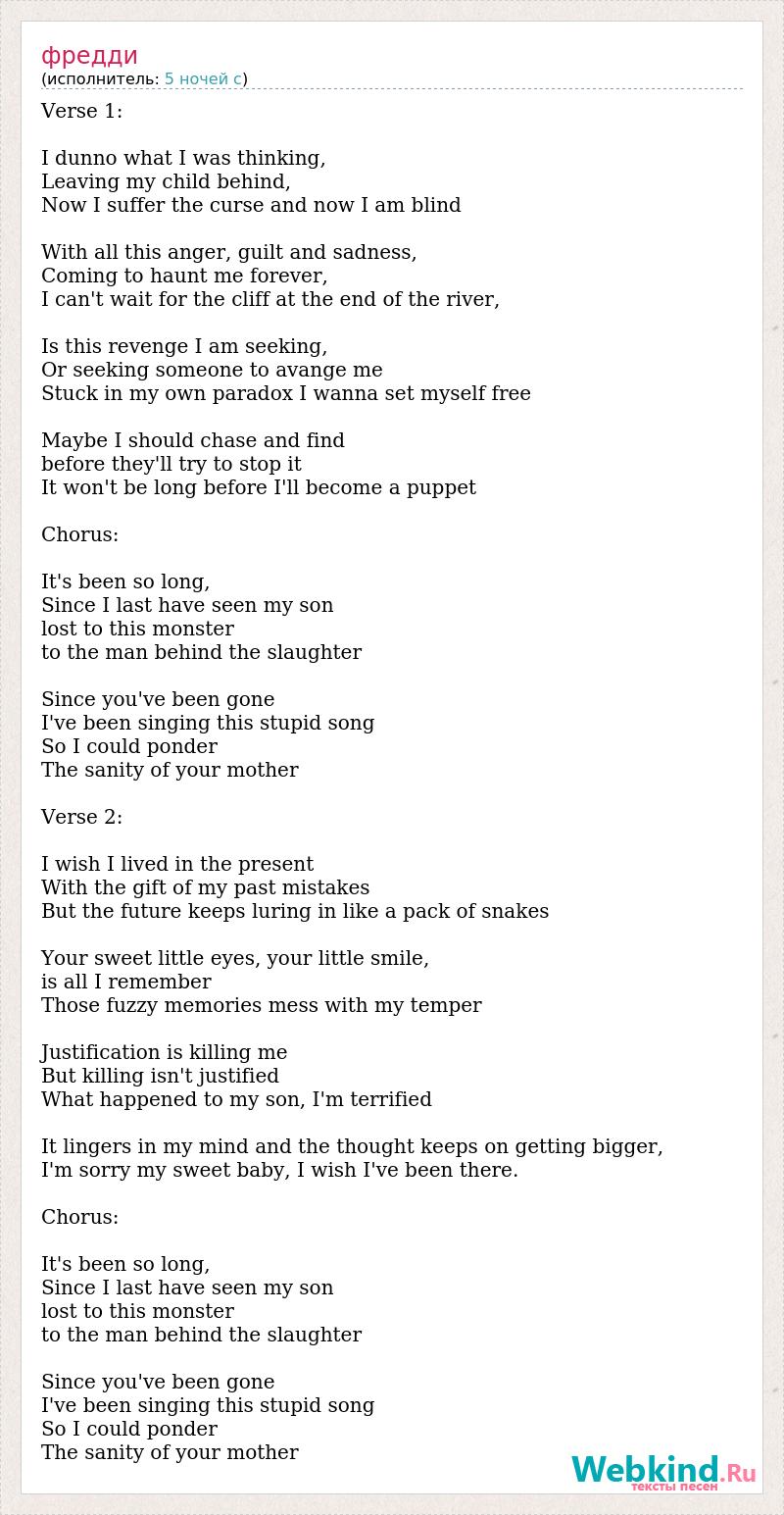 Verse 1: I dunno what I was thinking, Leaving my child behind, Now I suffer the curse and now I am blind With all this anger, guilt and sadness, Coming to haunt me forever, I can't wait for the cliff at the end of the river, Is this revenge I am seeking, Or seeking someone to avange me Stuck in my own paradox I wanna set myself free Maybe I should chase and find before they'll try to stop it It won't be long before I'll become a puppet Chorus: It's been so long, Since I last have seen my son lost to this monster to the man behind the slaughter Since you've been gone I've been singing this stupid song So I could ponder The sanity of your mother Verse 2: I wish I lived in the present With the gift of my past mistakes But the future keeps luring in like a pack of snakes Your sweet little eyes, your little smile, is all I remember Those fuzzy memories mess with my temper Justification is killing me But killing isn't justified What happened to my son, I'm terrified It lingers in my mind and the thought keeps on getting bigger, I'm sorry my sweet baby, I wish I've been there. Chorus: It's been so long, Since I last have seen my son lost to this monster to the man behind the slaughter Since you've been gone I've been singing this stupid song So I could ponder The sanity of your mother