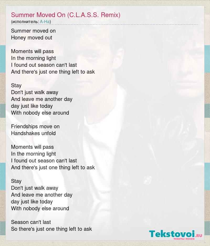 Summer moved on Honey moved out Moments will pass In the morning light I found out season can't last And there's just one thing left to ask Stay Don't just walk away And leave me another day day just like today With nobody else around Friendships move on Handshakes unfold Moments will pass In the morning light I found out season can't last And there's just one thing left to ask Stay Don't just walk away And leave me another day day just like today With nobody else around Season can't last So there's just one thing left to ask