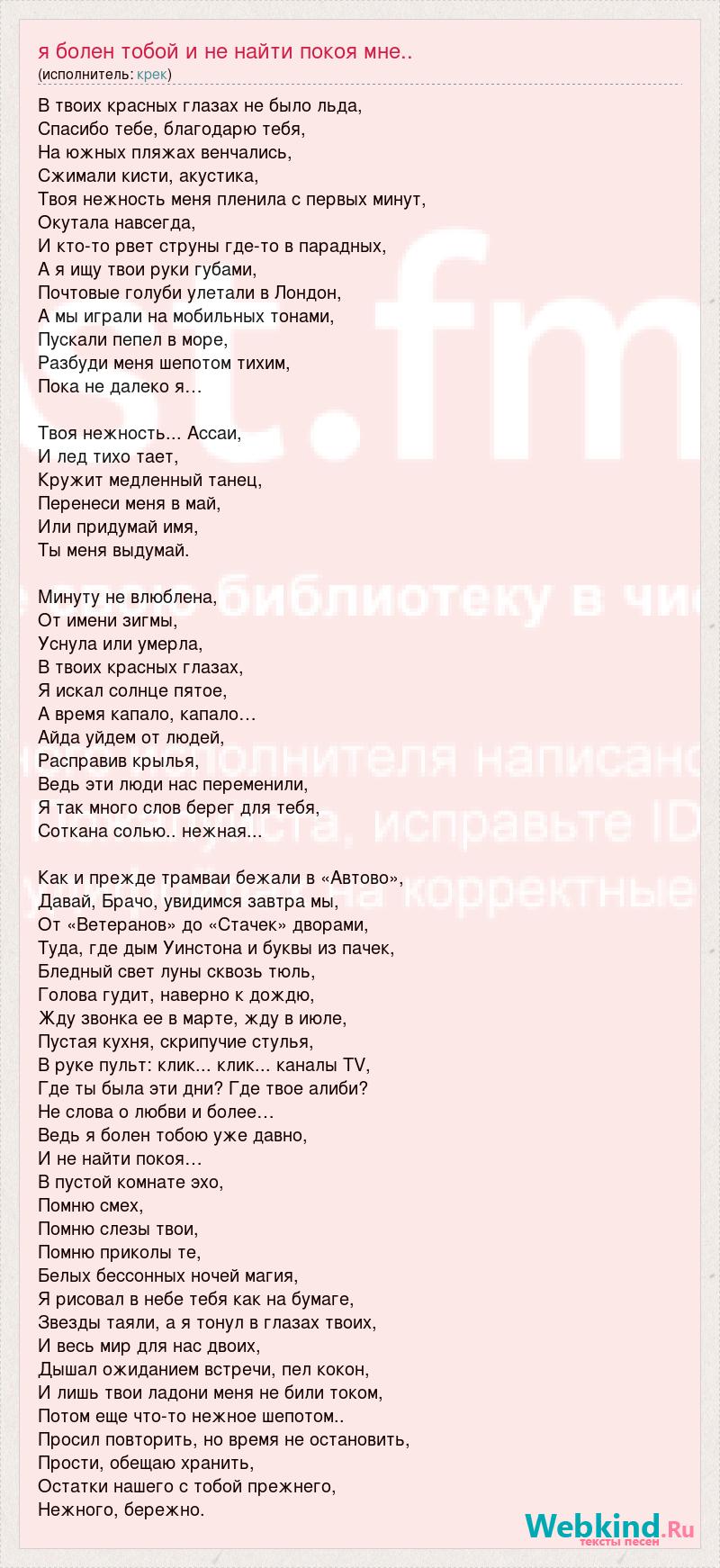 В твоих красных глазах не было льда, Спасибо тебе, благодарю тебя, На южных пляжах венчались, Сжимали кисти, акустика, Твоя нежность меня пленила с первых минут, Окутала навсегда, И кто-то рвет струны где-то в парадных, А я ищу твои руки губами, Почтовые голуби улетали в Лондон, А мы играли на мобильных тонами, Пускали пепел в море, Разбуди меня шепотом тихим, Пока не далеко я… Твоя нежность... Ассаи, И лед тихо тает, Кружит медленный танец, Перенеси меня в май, Или придумай имя, Ты меня выдумай. Минуту не влюблена, От имени зигмы, Уснула или умерла, В твоих красных глазах, Я искал солнце пятое, А время капало, капало… Айда уйдем от людей, Расправив крылья, Ведь эти люди нас переменили, Я так много слов берег для тебя, Соткана солью.. нежная... Как и прежде трамваи бежали в «Автово», Давай, Брачо, увидимся завтра мы, От «Ветеранов» до «Стачек» дворами, Туда, где дым Уинстона и буквы из пачек, Бледный свет луны сквозь тюль, Голова гудит, наверно к дождю, Жду звонка ее в марте, жду в июле, Пустая кухня, скрипучие стулья, В руке пульт: клик... клик... каналы TV, Где ты была эти дни? Где твое алиби? Не слова о любви и более… Ведь я болен тобою уже давно, И не найти покоя… В пустой комнате эхо, Помню смех, Помню слезы твои, Помню приколы те, Белых бессонных ночей магия, Я рисовал в небе тебя как на бумаге, Звезды таяли, а я тонул в глазах твоих, И весь мир для нас двоих, Дышал ожиданием встречи, пел кокон, И лишь твои ладони меня не били током, Потом еще что-то нежное шепотом.. Просил повторить, но время не остановить, Прости, обещаю хранить, Остатки нашего с тобой прежнего, Нежного, бережно.