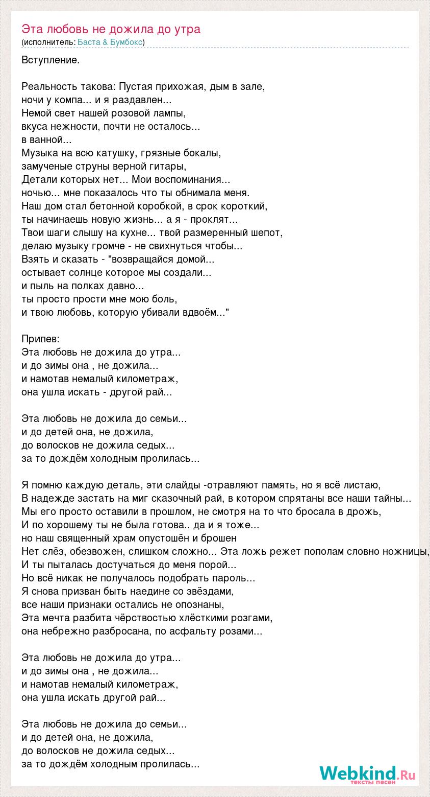 Вступление. Реальность такова: Пустая прихожая, дым в зале, ночи у компа... и я раздавлен... Немой свет нашей розовой лампы, вкуса нежности, почти не осталось... в ванной... Музыка на всю катушку, грязные бокалы, замученые струны верной гитары, Детали которых нет... Мои воспоминания... ночью... мне показалось что ты обнимала меня. Наш дом стал бетонной коробкой, в срок короткий, ты начинаешь новую жизнь... а я - проклят... Твои шаги слышу на кухне... твой размеренный шепот, делаю музыку громче - не свихнуться чтобы... Взять и сказать - "возвращайся домой... остывает солнце которое мы создали... и пыль на полках давно... ты просто прости мне мою боль, и твою любовь, которую убивали вдвоём..." Припев: Эта любовь не дожила до утра... и до зимы она , не дожила... и намотав немалый километраж, она ушла искать - другой рай... Эта любовь не дожила до семьи... и до детей она, не дожила, до волосков не дожила седых... за то дождём холодным пролилась... Я помню каждую деталь, эти слайды -отравляют память, но я всё листаю, В надежде застать на миг сказочный рай, в котором спрятаны все наши тайны... Мы его просто оставили в прошлом, не смотря на то что бросала в дрожь, И по хорошему ты не была готова.. да и я тоже... но наш священный храм опустошён и брошен Нет слёз, обезвожен, слишком сложно... Эта ложь режет пополам словно ножницы, И ты пыталась достучаться до меня порой... Но всё никак не получалось подобрать пароль... Я снова призван быть наедине со звёздами, все наши признаки остались не опознаны, Эта мечта разбита чёрствостью хлёсткими розгами, она небрежно разбросана, по асфальту розами... Эта любовь не дожила до утра... и до зимы она , не дожила... и намотав немалый километраж, она ушла искать другой рай... Эта любовь не дожила до семьи... и до детей она, не дожила, до волосков не дожила седых... за то дождём холодным пролилась...