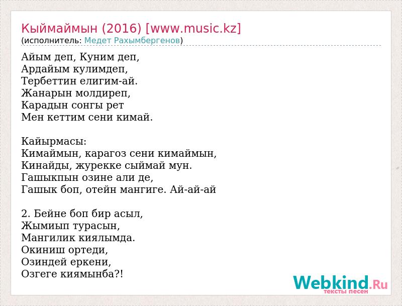 Айым деп, Куним деп, Ардайым кулимдеп, Тербеттин елигим-ай. Жанарын молдиреп, Карадын сонгы рет Мен кеттим сени кимай. Кайырмасы: Кимаймын, карагоз сени кимаймын, Кинайды, журекке сыймай мун. Гашыкпын озине али де, Гашык боп, отейн мангиге. Ай-ай-ай 2. Бейне боп бир асыл, Жымиып турасын, Мангилик киялымда. Окиниш ортеди, Озиндей еркени, Озгеге киямынба?!