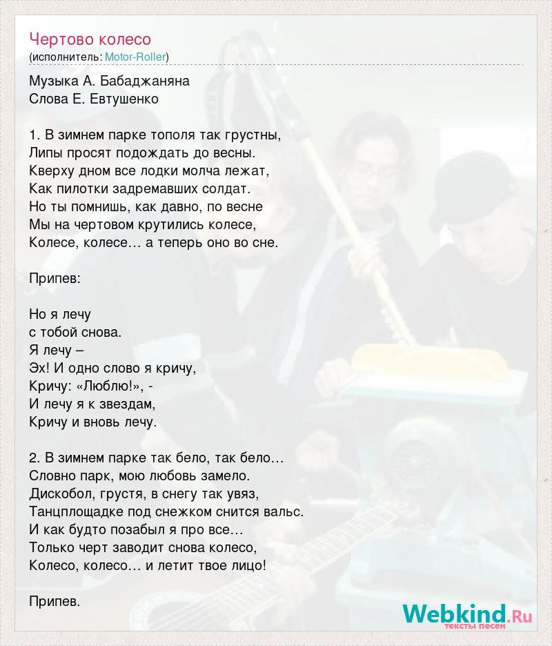 Музыка А. Бабаджаняна Слова Е. Евтушенко 1. В зимнем парке тополя так грустны, Липы просят подождать до весны. Кверху дном все лодки молча лежат, Как пилотки задремавших солдат. Но ты помнишь, как давно, по весне Мы на чертовом крутились колесе, Колесе, колесе… а теперь оно во сне. Припев: Но я лечу с тобой снова. Я лечу – Эх! И одно слово я кричу, Кричу: «Люблю!», - И лечу я к звездам, Кричу и вновь лечу. 2. В зимнем парке так бело, так бело… Словно парк, мою любовь замело. Дискобол, грустя, в снегу так увяз, Танцплощадке под снежком снится вальс. И как будто позабыл я про все… Только черт заводит снова колесо, Колесо, колесо… и летит твое лицо! Припев.