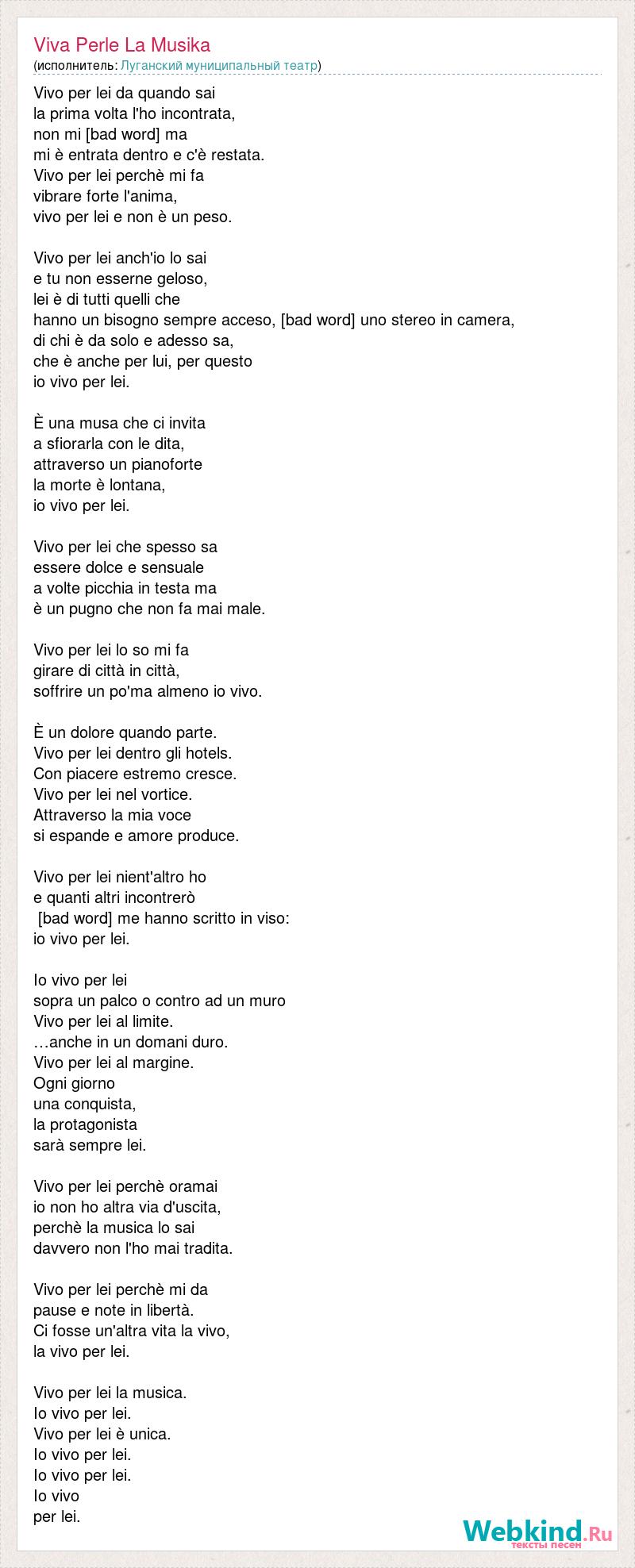 Vivo per lei da quando sai la prima volta l'ho incontrata, non mi [bad word] ma mi è entrata dentro e c'è restata. Vivo per lei perchè mi fa vibrare forte l'anima, vivo per lei e non è un peso. Vivo per lei anch'io lo sai e tu non esserne geloso, lei è di tutti quelli che hanno un bisogno sempre acceso, [bad word] uno stereo in camera, di chi è da solo e adesso sa, che è anche per lui, per questo io vivo per lei. È una musa che ci invita a sfiorarla con le dita, attraverso un pianoforte la morte è lontana, io vivo per lei. Vivo per lei che spesso sa essere dolce e sensuale a volte picchia in testa ma è un pugno che non fa mai male. Vivo per lei lo so mi fa girare di città in città, soffrire un po'ma almeno io vivo. È un dolore quando parte. Vivo per lei dentro gli hotels. Con piacere estremo cresce. Vivo per lei nel vortice. Attraverso la mia voce si espande e amore produce. Vivo per lei nient'altro ho e quanti altri incontrerò [bad word] me hanno scritto in viso: io vivo per lei. Io vivo per lei sopra un palco o contro ad un muro Vivo per lei al limite. …anche in un domani duro. Vivo per lei al margine. Ogni giorno una conquista, la protagonista sarà sempre lei. Vivo per lei perchè oramai io non ho altra via d'uscita, perchè la musica lo sai davvero non l'ho mai tradita. Vivo per lei perchè mi da pause e note in libertà. Ci fosse un'altra vita la vivo, la vivo per lei. Vivo per lei la musica. Io vivo per lei. Vivo per lei è unica. Io vivo per lei. Io vivo per lei. Io vivo per lei.