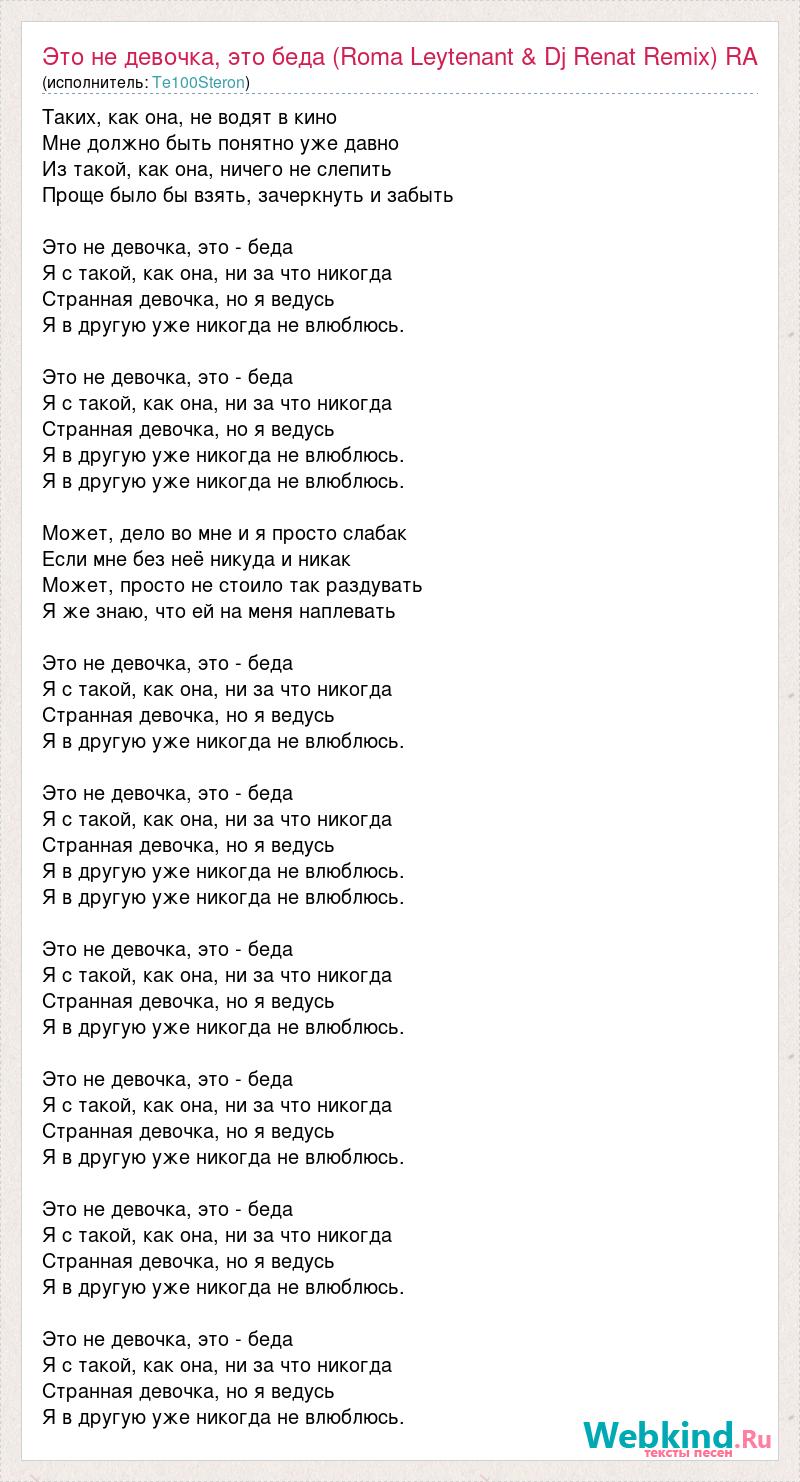Таких, как она, не водят в кино Мне должно быть понятно уже давно Из такой, как она, ничего не слепить Проще было бы взять, зачеркнуть и забыть Это не девочка, это - беда Я с такой, как она, ни за что никогда Странная девочка, но я ведусь Я в другую уже никогда не влюблюсь. Это не девочка, это - беда Я с такой, как она, ни за что никогда Странная девочка, но я ведусь Я в другую уже никогда не влюблюсь. Я в другую уже никогда не влюблюсь. Может, дело во мне и я просто слабак Если мне без неё никуда и никак Может, просто не стоило так раздувать Я же знаю, что ей на меня наплевать Это не девочка, это - беда Я с такой, как она, ни за что никогда Странная девочка, но я ведусь Я в другую уже никогда не влюблюсь. Это не девочка, это - беда Я с такой, как она, ни за что никогда Странная девочка, но я ведусь Я в другую уже никогда не влюблюсь. Я в другую уже никогда не влюблюсь. Это не девочка, это - беда Я с такой, как она, ни за что никогда Странная девочка, но я ведусь Я в другую уже никогда не влюблюсь. Это не девочка, это - беда Я с такой, как она, ни за что никогда Странная девочка, но я ведусь Я в другую уже никогда не влюблюсь. Это не девочка, это - беда Я с такой, как она, ни за что никогда Странная девочка, но я ведусь Я в другую уже никогда не влюблюсь. Это не девочка, это - беда Я с такой, как она, ни за что никогда Странная девочка, но я ведусь Я в другую уже никогда не влюблюсь.