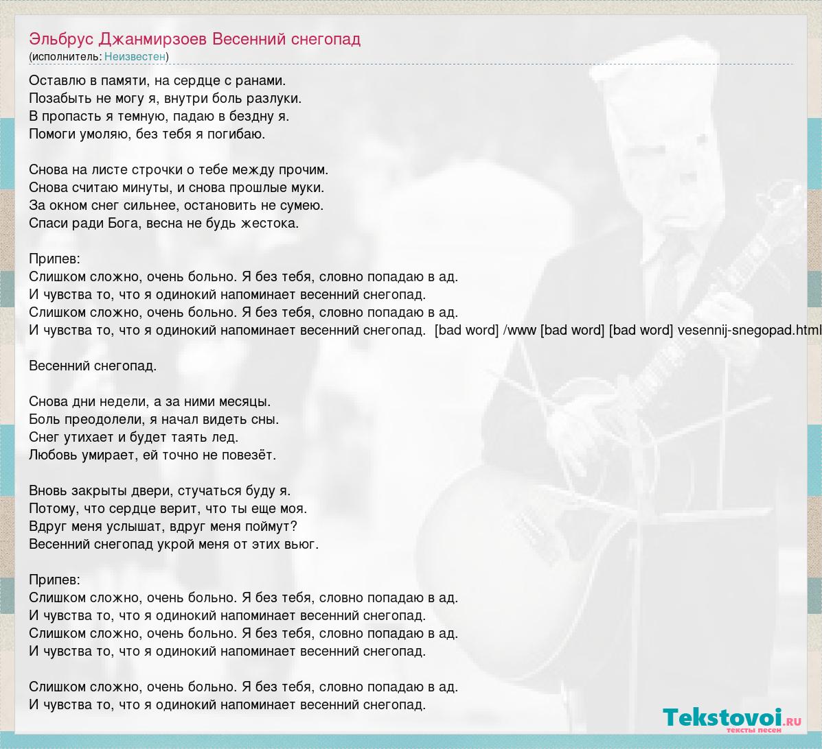 Оставлю в памяти, на сердце с ранами. Позабыть не могу я, внутри боль разлуки. В пропасть я темную, падаю в бездну я. Помоги умоляю, без тебя я погибаю. Снова на листе строчки о тебе между прочим. Снова считаю минуты, и снова прошлые муки. За окном снег сильнее, остановить не сумею. Спаси ради Бога, весна не будь жестока. Припев: Слишком сложно, очень больно. Я без тебя, словно попадаю в ад. И чувства то, что я одинокий напоминает весенний снегопад. Слишком сложно, очень больно. Я без тебя, словно попадаю в ад. И чувства то, что я одинокий напоминает весенний снегопад. [bad word] /www [bad word] dzhanmirzoev-elbrus-vesennij-snegopad.html Весенний снегопад. Снова дни недели, а за ними месяцы. Боль преодолели, я начал видеть сны. Снег утихает и будет таять лед. Любовь умирает, ей точно не повезёт. Вновь закрыты двери, стучаться буду я. Потому, что сердце верит, что ты еще моя. Вдруг меня услышат, вдруг меня поймут? Весенний снегопад укрой меня от этих вьюг. Припев: Слишком сложно, очень больно. Я без тебя, словно попадаю в ад. И чувства то, что я одинокий напоминает весенний снегопад. Слишком сложно, очень больно. Я без тебя, словно попадаю в ад. И чувства то, что я одинокий напоминает весенний снегопад. Слишком сложно, очень больно. Я без тебя, словно попадаю в ад. И чувства то, что я одинокий напоминает весенний снегопад.