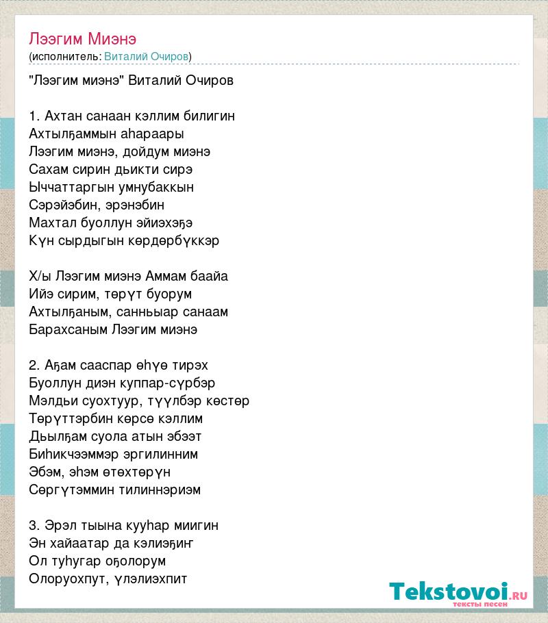 "Лээгим миэнэ" Виталий Очиров 1. Ахтан санаан кэллим билигин Ахтылҕаммын аhараары Лээгим миэнэ, дойдум миэнэ Сахам сирин дьикти сирэ Ыччаттаргын умнубаккын Сэрэйэбин, эрэнэбин Махтал буоллун эйиэхэҕэ Күн сырдыгын көрдөрбүккэр Х/ы Лээгим миэнэ Аммам баайа Ийэ сирим, төрүт буорум Ахтылҕаным, санньыар санаам Барахсаным Лээгим миэнэ 2. Аҕам сааспар өhүө тирэх Буоллун диэн куппар-сүрбэр Мэлдьи суохтуур, түүлбэр көстөр Төрүттэрбин көрсө кэллим Дьылҕам суола атын эбээт Биhикчээммэр эргилинним Эбэм, эhэм өтөхтөрүн Сөргүтэммин тилиннэриэм 3. Эрэл тыына кууhар миигин Эн хайаатар да кэлиэҕиҥ Ол туhугар оҕолорум Олоруохпут, үлэлиэхпит
