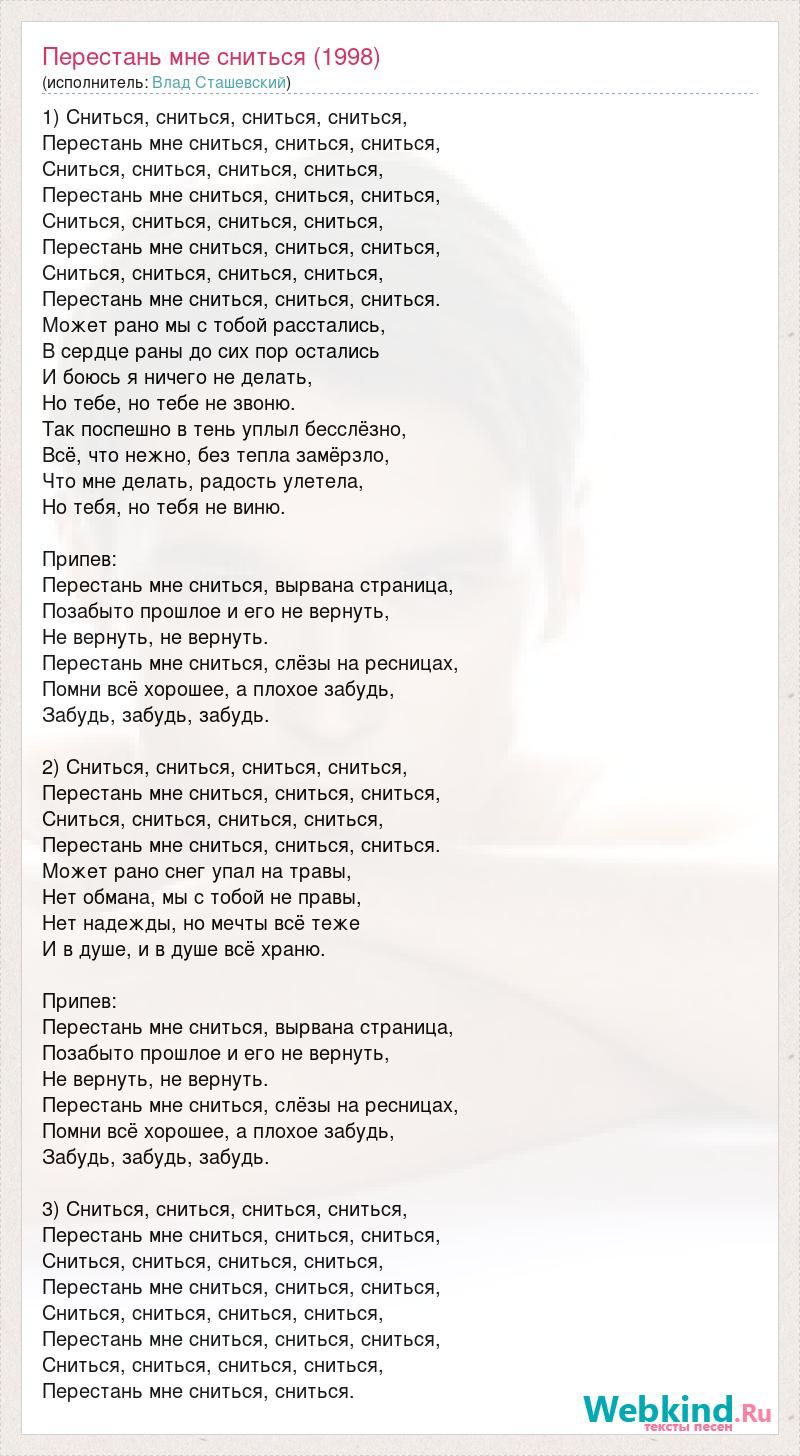 1) Сниться, сниться, сниться, сниться, Перестань мне сниться, сниться, сниться, Сниться, сниться, сниться, сниться, Перестань мне сниться, сниться, сниться, Сниться, сниться, сниться, сниться, Перестань мне сниться, сниться, сниться, Сниться, сниться, сниться, сниться, Перестань мне сниться, сниться, сниться. Может рано мы с тобой расстались, В сердце раны до сих пор остались И боюсь я ничего не делать, Но тебе, но тебе не звоню. Так поспешно в тень уплыл бесслёзно, Всё, что нежно, без тепла замёрзло, Что мне делать, радость улетела, Но тебя, но тебя не виню. Припев: Перестань мне сниться, вырвана страница, Позабыто прошлое и его не вернуть, Не вернуть, не вернуть. Перестань мне сниться, слёзы на ресницах, Помни всё хорошее, а плохое забудь, Забудь, забудь, забудь. 2) Сниться, сниться, сниться, сниться, Перестань мне сниться, сниться, сниться, Сниться, сниться, сниться, сниться, Перестань мне сниться, сниться, сниться. Может рано снег упал на травы, Нет обмана, мы с тобой не правы, Нет надежды, но мечты всё теже И в душе, и в душе всё храню. Припев: Перестань мне сниться, вырвана страница, Позабыто прошлое и его не вернуть, Не вернуть, не вернуть. Перестань мне сниться, слёзы на ресницах, Помни всё хорошее, а плохое забудь, Забудь, забудь, забудь. 3) Сниться, сниться, сниться, сниться, Перестань мне сниться, сниться, сниться, Сниться, сниться, сниться, сниться, Перестань мне сниться, сниться, сниться, Сниться, сниться, сниться, сниться, Перестань мне сниться, сниться, сниться, Сниться, сниться, сниться, сниться, Перестань мне сниться, сниться.