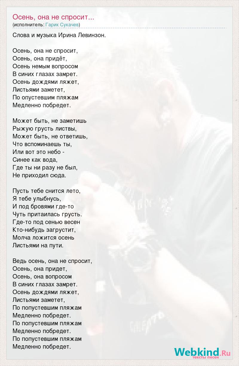 Слова и музыка Ирина Левинзон. Осень, она не спросит, Осень, она придёт, Осень немым вопросом В синих глазах замрет. Осень дождями ляжет, Листьями заметет, По опустевшим пляжам Медленно побредет. Может быть, не заметишь Рыжую грусть листвы, Может быть, не ответишь, Что вспоминаешь ты, Или вот это небо - Синее как вода, Где ты ни разу не был, Не приходил сюда. Пусть тебе снится лето, Я тебе улыбнусь, И под бровями где-то Чуть притаилась грусть. Где-то под сенью весен Кто-нибудь загрустит, Молча ложится осень Листьями на пути. Ведь осень, она не спросит, Осень, она придет, Осень, она вопросом В синих глазах замрет. Осень дождями ляжет, Листьями заметет, По попустевшим пляжам Медленно побредет. По попустевшим пляжам Медленно побредет. По попустевшим пляжам Медленно побредет.