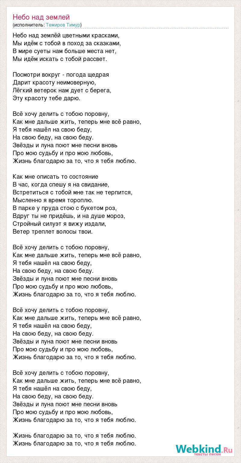 Небо над землёй цветными красками, Мы идём с тобой в поход за сказками, В мире суеты нам больше места нет, Мы идём искать с тобой рассвет. Посмотри вокруг - погода щедрая Дарит красоту неимоверную, Лёгкий ветерок нам дует с берега, Эту красоту тебе дарю. Всё хочу делить с тобою поровну, Как мне дальше жить, теперь мне всё равно, Я тебя нашёл на свою беду, На свою беду, на свою беду. Звёзды и луна поют мне песни вновь Про мою судьбу и про мою любовь, Жизнь благодарю за то, что я тебя люблю. Как мне описать то состояние В час, когда спешу я на свидание, Встретиться с тобой мне так не терпится, Мысленно я время тороплю. В парке у пруда стою с букетом роз, Вдруг ты не придёшь, и на душе мороз, Стройный силуэт я вижу издали, Ветер треплет волосы твои. Всё хочу делить с тобою поровну, Как мне дальше жить, теперь мне всё равно, Я тебя нашёл на свою беду, На свою беду, на свою беду. Звёзды и луна поют мне песни вновь Про мою судьбу и про мою любовь, Жизнь благодарю за то, что я тебя люблю. Всё хочу делить с тобою поровну, Как мне дальше жить, теперь мне всё равно, Я тебя нашёл на свою беду, На свою беду, на свою беду. Звёзды и луна поют мне песни вновь Про мою судьбу и про мою любовь, Жизнь благодарю за то, что я тебя люблю. Всё хочу делить с тобою поровну, Как мне дальше жить, теперь мне всё равно, Я тебя нашёл на свою беду, На свою беду, на свою беду. Звёзды и луна поют мне песни вновь Про мою судьбу и про мою любовь, Жизнь благодарю за то, что я тебя люблю. Жизнь благодарю за то, что я тебя люблю. Жизнь благодарю за то, что я тебя люблю.