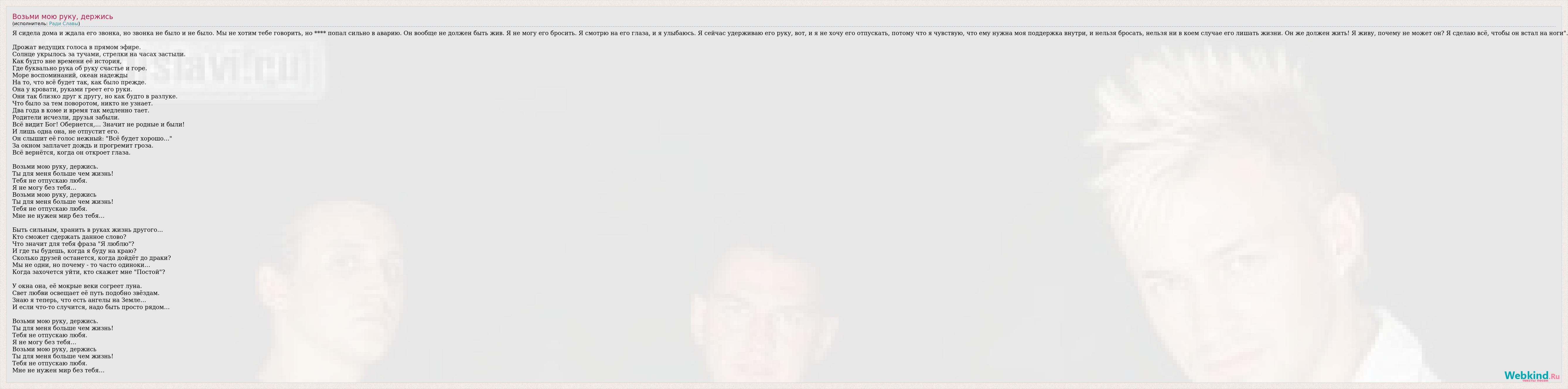Я сидела дома и ждала его звонка, но звонка не было и не было. Мы не хотим тебе говорить, но **** попал сильно в аварию. Он вообще не должен быть жив. Я не могу его бросить. Я смотрю на его глаза, и я улыбаюсь. Я сейчас удерживаю его руку, вот, и я не хочу его отпускать, потому что я чувствую, что ему нужна моя поддержка внутри, и нельзя бросать, нельзя ни в коем случае его лишать жизни. Он же должен жить! Я живу, почему не может он? Я сделаю всё, чтобы он встал на ноги". Дрожат ведущих голоса в прямом эфире. Солнце укрылось за тучами, стрелки на часах застыли. Как будто вне времени её история, Где буквально рука об руку счастье и горе. Море воспоминаний, океан надежды На то, что всё будет так, как было прежде. Она у кровати, руками греет его руки. Они так близко друг к другу, но как будто в разлуке. Что было за тем поворотом, никто не узнает. Два года в коме и время так медленно тает. Родители исчезли, друзья забыли. Всё видит Бог! Обернется,… Значит не родные и были! И лишь одна она, не отпустит его. Он слышит её голос нежный: "Всё будет хорошо…" За окном заплачет дождь и прогремит гроза. Всё вернётся, когда он откроет глаза. Возьми мою руку, держись. Ты для меня больше чем жизнь! Тебя не отпускаю любя. Я не могу без тебя… Возьми мою руку, держись Ты для меня больше чем жизнь! Тебя не отпускаю любя. Мне не нужен мир без тебя… Быть сильным, хранить в руках жизнь другого… Кто сможет сдержать данное слово? Что значит для тебя фраза "Я люблю"? И где ты будешь, когда я буду на краю? Сколько друзей останется, когда дойдёт до драки? Мы не одни, но почему - то часто одиноки… Когда захочется уйти, кто скажет мне "Постой"? У окна она, её мокрые веки согреет луна. Свет любви освещает её путь подобно звёздам. Знаю я теперь, что есть ангелы на Земле… И если что-то случится, надо быть просто рядом… Возьми мою руку, держись. Ты для меня больше чем жизнь! Тебя не отпускаю любя. Я не могу без тебя… Возьми мою руку, держись Ты для меня больше чем жизнь! Тебя не отпускаю любя. Мне не нужен мир без тебя…