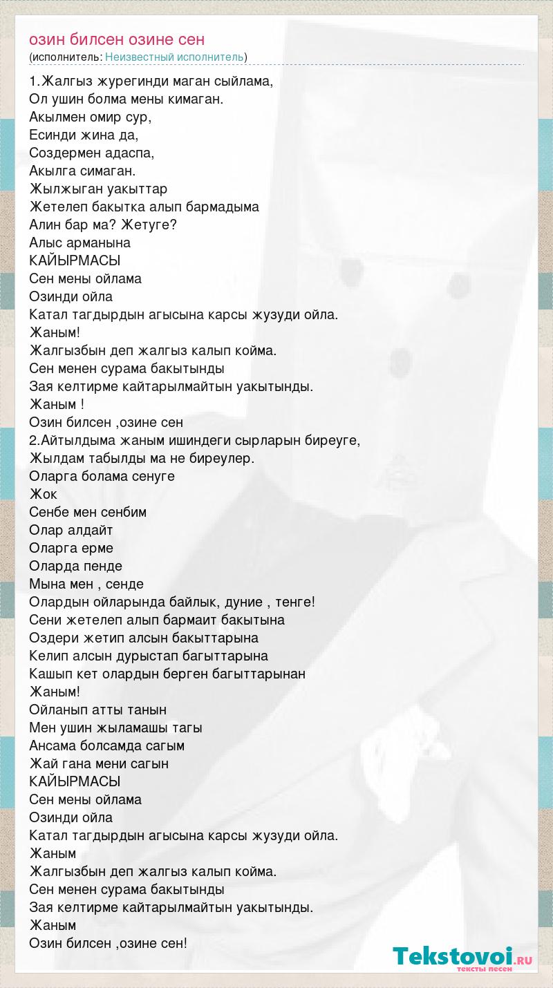 1.Жалгыз журегинди маган сыйлама, Ол ушин болма мены кимаган. Акылмен омир сур, Есинди жина да, Создермен адаспа, Акылга симаган. Жылжыган уакыттар Жетелеп бакытка алып бармадыма Алин бар ма? Жетуге? Алыс арманына КАЙЫРМАСЫ Сен мены ойлама Озинди ойла Катал тагдырдын агысына карсы жузуди ойла. Жаным! Жалгызбын деп жалгыз калып койма. Сен менен сурама бакытынды Зая келтирме кайтарылмайтын уакытынды. Жаным ! Озин билсен ,озине сен 2.Айтылдыма жаным ишиндеги сырларын биреуге, Жылдам табылды ма не биреулер. Оларга болама сенуге Жок Сенбе мен сенбим Олар алдайт Оларга ерме Оларда пенде Мына мен , сенде Олардын ойларында байлык, дуние , тенге! Сени жетелеп алып бармаит бакытына Оздери жетип алсын бакыттарына Келип алсын дурыстап багыттарына Кашып кет олардын берген багыттарынан Жаным! Ойланып атты танын Мен ушин жыламашы тагы Ансама болсамда сагым Жай гана мени сагын КАЙЫРМАСЫ Сен мены ойлама Озинди ойла Катал тагдырдын агысына карсы жузуди ойла. Жаным Жалгызбын деп жалгыз калып койма. Сен менен сурама бакытынды Зая келтирме кайтарылмайтын уакытынды. Жаным Озин билсен ,озине сен!