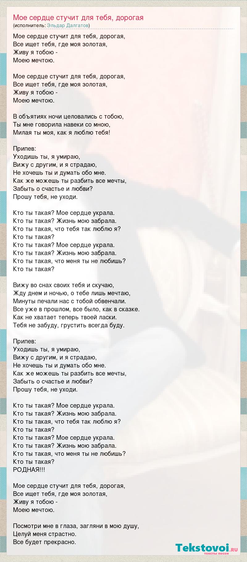 Мое сердце стучит для тебя, дорогая, Все ищет тебя, где моя золотая, Живу я тобою - Моею мечтою. Мое сердце стучит для тебя, дорогая, Все ищет тебя, где моя золотая, Живу я тобою - Моею мечтою. В объятиях ночи целовались с тобою, Ты мне говорила навеки со мною, Милая ты моя, как я люблю тебя! Припев: Уходишь ты, я умираю, Вижу с другим, и я страдаю, Не хочешь ты и думать обо мне. Как же можешь ты разбить все мечты, Забыть о счастье и любви? Прошу тебя, не уходи. Кто ты такая? Мое сердце украла. Кто ты такая? Жизнь мою забрала. Кто ты такая, что тебя так люблю я? Кто ты такая? Кто ты такая? Мое сердце украла. Кто ты такая? Жизнь мою забрала. Кто ты такая, что меня ты не любишь? Кто ты такая? Вижу во снах своих тебя и скучаю, Жду днем и ночью, о тебе лишь мечтаю, Минуты печали нас с тобой обвенчали. Все уже в прошлом, все было, как в сказке. Как не хватает теперь твоей ласки. Тебя не забуду, грустить всегда буду. Припев: Уходишь ты, я умираю, Вижу с другим, и я страдаю, Не хочешь ты и думать обо мне. Как же можешь ты разбить все мечты, Забыть о счастье и любви? Прошу тебя, не уходи. Кто ты такая? Мое сердце украла. Кто ты такая? Жизнь мою забрала. Кто ты такая, что тебя так люблю я? Кто ты такая? Кто ты такая? Мое сердце украла. Кто ты такая? Жизнь мою забрала. Кто ты такая, что меня ты не любишь? Кто ты такая? РОДНАЯ!!! Мое сердце стучит для тебя, дорогая, Все ищет тебя, где моя золотая, Живу я тобою - Моею мечтою. Посмотри мне в глаза, загляни в мою душу, Целуй меня страстно. Все будет прекрасно.
