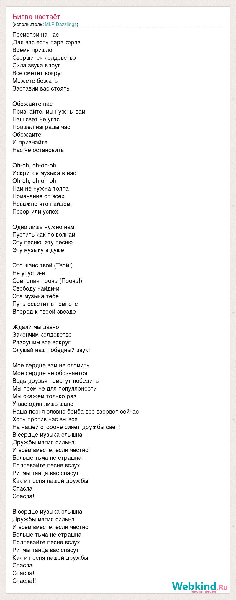 Посмотри на нас Для вас есть пара фраз Время пришло Свершится колдовство Сила звука вдруг Все сметет вокруг Можете бежать Заставим вас стоять Обожайте нас Признайте, мы нужны вам Наш свет не угас Пришел награды час Обожайте И признайте Нас не остановить Oh-oh, oh-oh-oh Искрится музыка в нас Oh-oh, oh-oh-oh Нам не нужна толпа Признание от всех Неважно что найдем, Позор или успех Одно лишь нужно нам Пустить как по волнам Эту песню, эту песню Эту музыку в душе Это шанс твой (Твой!) Не упусти-и Сомнения прочь (Прочь!) Свободу найди-и Эта музыка тебе Путь осветит в темноте Вперед к твоей звезде Ждали мы давно Закончим колдовство Разрушим все вокруг Слушай наш победный звук! Мое сердце вам не сломить Мое сердце не обознается Ведь друзья помогут победить Мы поем не для популярности Мы скажем только раз У вас один лишь шанс Наша песня словно бомба все взорвет сейчас Хоть против нас вы все На нашей стороне сияет дружбы свет! В сердце музыка слышна Дружбы магия сильна И всем вместе, если честно Больше тьма не страшна Подпевайте песне вслух Ритмы танца вас спасут Как и песня нашей дружбы Спасла Спасла! В сердце музыка слышна Дружбы магия сильна И всем вместе, если честно Больше тьма не страшна Подпевайте песне вслух Ритмы танца вас спасут Как и песня нашей дружбы Спасла Спасла! Спасла!!!