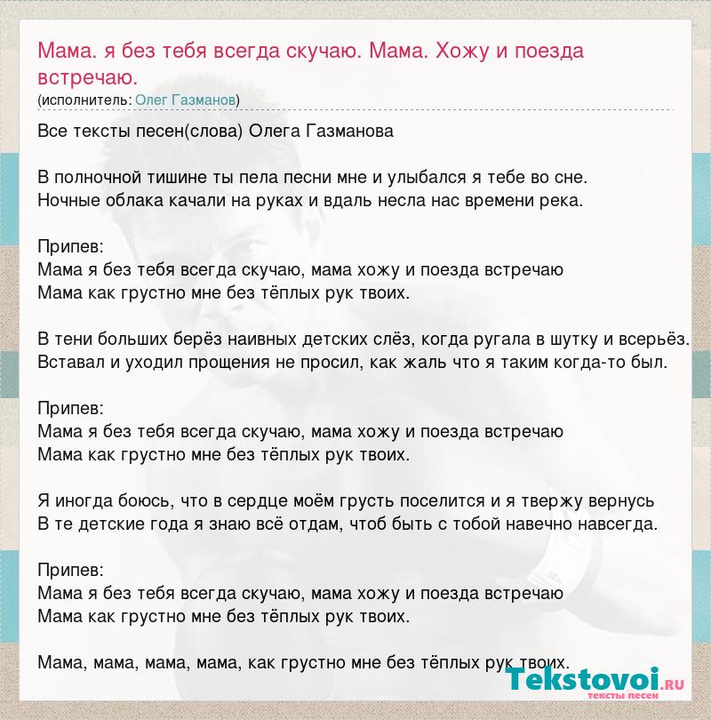 Все тексты песен(слова) Олега Газманова В полночной тишине ты пела песни мне и улыбался я тебе во сне. Ночные облака качали на руках и вдаль несла нас времени река. Припев: Мама я без тебя всегда скучаю, мама хожу и поезда встречаю Мама как грустно мне без тёплых рук твоих. В тени больших берёз наивных детских слёз, когда ругала в шутку и всерьёз. Вставал и уходил прощения не просил, как жаль что я таким когда-то был. Припев: Мама я без тебя всегда скучаю, мама хожу и поезда встречаю Мама как грустно мне без тёплых рук твоих. Я иногда боюсь, что в сердце моём грусть поселится и я твержу вернусь В те детские года я знаю всё отдам, чтоб быть с тобой навечно навсегда. Припев: Мама я без тебя всегда скучаю, мама хожу и поезда встречаю Мама как грустно мне без тёплых рук твоих. Мама, мама, мама, мама, как грустно мне без тёплых рук твоих.