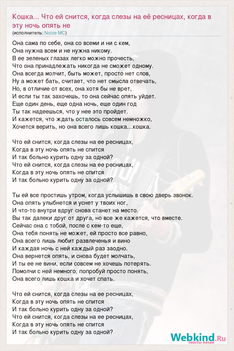 Главная→Исполнители→Noize MC→Кошка... Что ей снится, когда слезы на её ресницах, когда в эту ночь оп
