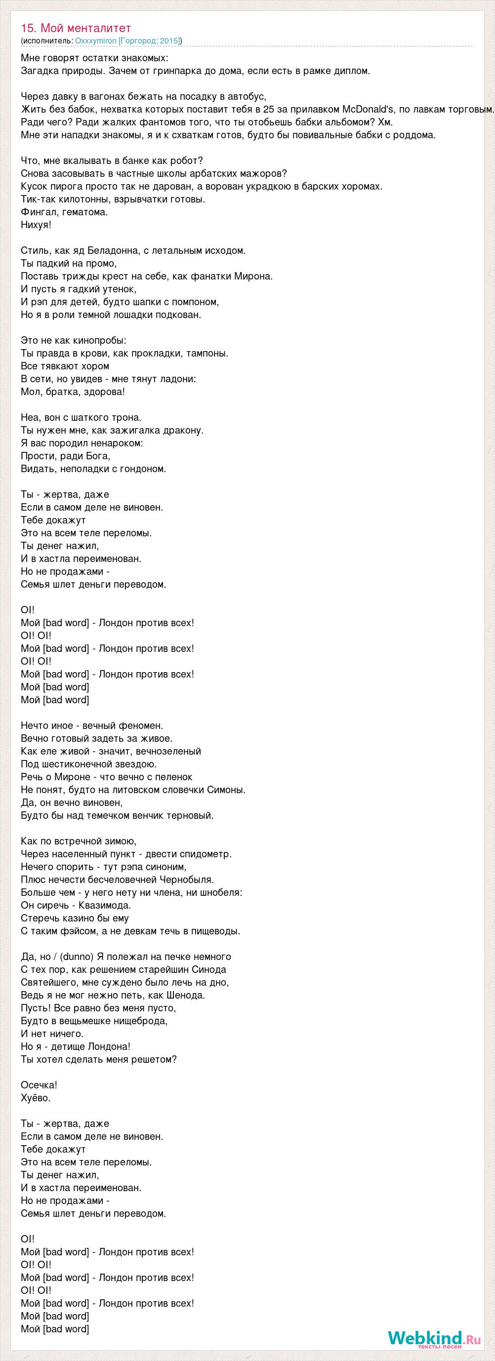 Мне говорят остатки знакомых: Загадка природы. Зачем от гринпарка до дома, если есть в рамке диплом. Через давку в вагонах бежать на посадку в автобус, Жить без бабок, нехватка которых поставит тебя в 25 за прилавком McDonald's, по лавкам торговым. Ради чего? Ради жалких фантомов того, что ты отобьешь бабки альбомом? Хм. Мне эти нападки знакомы, я и к схваткам готов, будто бы повивальные бабки с роддома. Что, мне вкалывать в банке как робот? Снова засовывать в частные школы арбатских мажоров? Кусок пирога просто так не дарован, а ворован украдкою в барских хоромах. Тик-так килотонны, взрывчатки готовы. Фингал, гематома. Нихуя! Стиль, как яд Беладонна, с летальным исходом. Ты падкий на промо, Поставь трижды крест на себе, как фанатки Мирона. И пусть я гадкий утенок, И рэп для детей, будто шапки с помпоном, Но я в роли темной лошадки подкован. Это не как кинопробы: Ты правда в крови, как прокладки, тампоны. Все тявкают хором В сети, но увидев - мне тянут ладони: Мол, братка, здорова! Неа, вон с шаткого трона. Ты нужен мне, как зажигалка дракону. Я вас породил ненароком: Прости, ради Бога, Видать, неполадки с гондоном. Ты - жертва, даже Если в самом деле не виновен. Тебе докажут Это на всем теле переломы. Ты денег нажил, И в хастла переименован. Но не продажами - Семья шлет деньги переводом. OI! Мой [bad word] - Лондон против всех! OI! OI! Мой [bad word] - Лондон против всех! OI! OI! Мой [bad word] - Лондон против всех! Мой [bad word] Мой [bad word] Нечто иное - вечный феномен. Вечно готовый задеть за живое. Как еле живой - значит, вечнозеленый Под шестиконечной звездою. Речь о Мироне - что вечно с пеленок Не понят, будто на литовском словечки Симоны. Да, он вечно виновен, Будто бы над темечком венчик терновый. Как по встречной зимою, Через населенный пункт - двести спидометр. Нечего спорить - тут рэпа синоним, Плюс нечести бесчеловечней Чернобыля. Больше чем - у него нету ни члена, ни шнобеля: Он сиречь - Квазимода. Стеречь казино бы ему С таким фэйсом, а не девкам течь в пищеводы. Да, но / (dunno) Я полежал на печке немного С тех пор, как решением старейшин Синода Святейшего, мне суждено было лечь на дно, Ведь я не мог нежно петь, как Шенода. Пусть! Все равно без меня пусто, Будто в вещьмешке нищеброда, И нет ничего. Но я - детище Лондона! Ты хотел сделать меня решетом? Осечка! Хуёво. Ты - жертва, даже Если в самом деле не виновен. Тебе докажут Это на всем теле переломы. Ты денег нажил, И в хастла переименован. Но не продажами - Семья шлет деньги переводом. OI! Мой [bad word] - Лондон против всех! OI! OI! Мой [bad word] - Лондон против всех! OI! OI! Мой [bad word] - Лондон против всех! Мой [bad word] Мой [bad word]