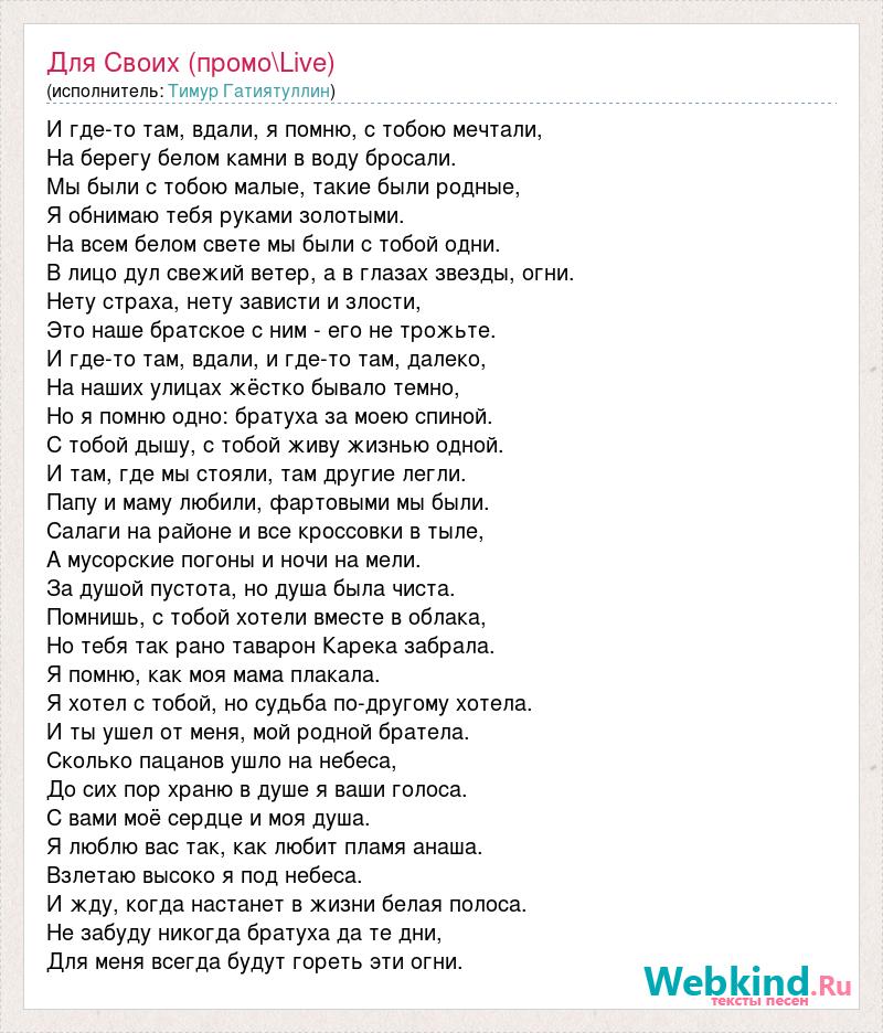 И где-то там, вдали, я помню, с тобою мечтали, На берегу белом камни в воду бросали. Мы были с тобою малые, такие были родные, Я обнимаю тебя руками золотыми. На всем белом свете мы были с тобой одни. В лицо дул свежий ветер, а в глазах звезды, огни. Нету страха, нету зависти и злости, Это наше братское с ним - его не трожьте. И где-то там, вдали, и где-то там, далеко, На наших улицах жёстко бывало темно, Но я помню одно: братуха за моею спиной. С тобой дышу, с тобой живу жизнью одной. И там, где мы стояли, там другие легли. Папу и маму любили, фартовыми мы были. Салаги на районе и все кроссовки в тыле, А мусорские погоны и ночи на мели. За душой пустота, но душа была чиста. Помнишь, с тобой хотели вместе в облака, Но тебя так рано таварон Карека забрала. Я помню, как моя мама плакала. Я хотел с тобой, но судьба по-другому хотела. И ты ушел от меня, мой родной братела. Сколько пацанов ушло на небеса, До сих пор храню в душе я ваши голоса. С вами моё сердце и моя душа. Я люблю вас так, как любит пламя анаша. Взлетаю высоко я под небеса. И жду, когда настанет в жизни белая полоса. Не забуду никогда братуха да те дни, Для меня всегда будут гореть эти огни.