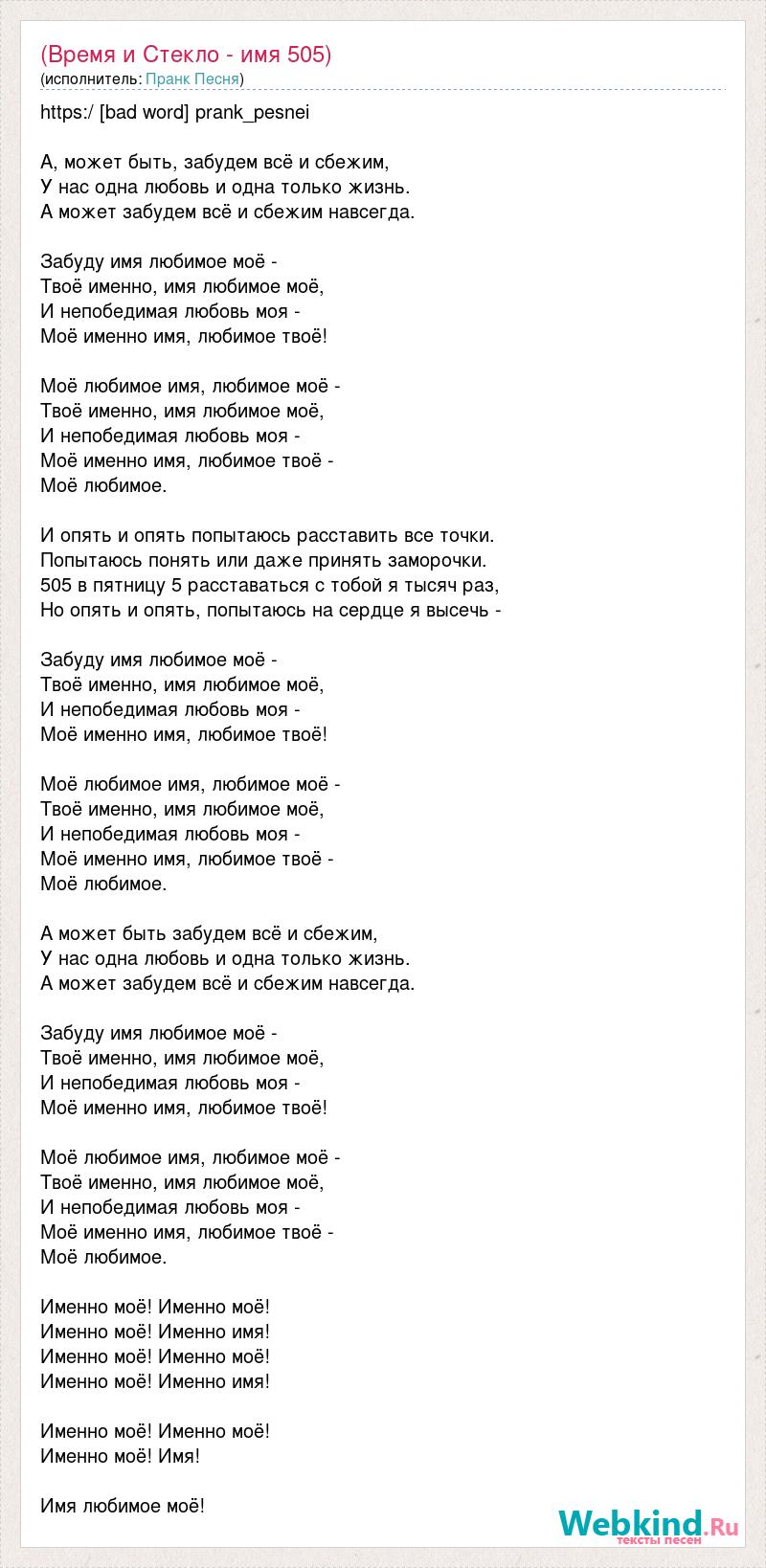 https:/ [bad word] prank_pesnei А, может быть, забудем всё и сбежим, У нас одна любовь и одна только жизнь. А может забудем всё и сбежим навсегда. Забуду имя любимое моё - Твоё именно, имя любимое моё, И непобедимая любовь моя - Моё именно имя, любимое твоё! Моё любимое имя, любимое моё - Твоё именно, имя любимое моё, И непобедимая любовь моя - Моё именно имя, любимое твоё - Моё любимое. И опять и опять попытаюсь расставить все точки. Попытаюсь понять или даже принять заморочки. 505 в пятницу 5 расставаться с тобой я тысяч раз, Но опять и опять, попытаюсь на сердце я высечь - Забуду имя любимое моё - Твоё именно, имя любимое моё, И непобедимая любовь моя - Моё именно имя, любимое твоё! Моё любимое имя, любимое моё - Твоё именно, имя любимое моё, И непобедимая любовь моя - Моё именно имя, любимое твоё - Моё любимое. А может быть забудем всё и сбежим, У нас одна любовь и одна только жизнь. А может забудем всё и сбежим навсегда. Забуду имя любимое моё - Твоё именно, имя любимое моё, И непобедимая любовь моя - Моё именно имя, любимое твоё! Моё любимое имя, любимое моё - Твоё именно, имя любимое моё, И непобедимая любовь моя - Моё именно имя, любимое твоё - Моё любимое. Именно моё! Именно моё! Именно моё! Именно имя! Именно моё! Именно моё! Именно моё! Именно имя! Именно моё! Именно моё! Именно моё! Имя! Имя любимое моё!