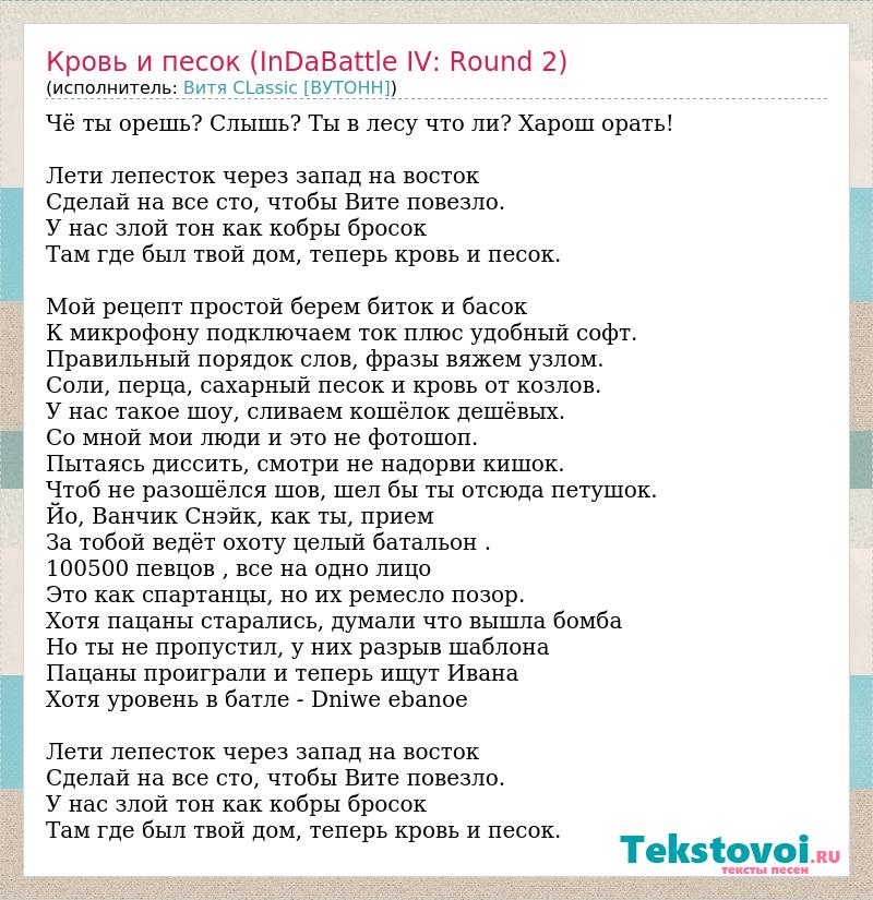 Чё ты орешь? Слышь? Ты в лесу что ли? Харош орать! Лети лепесток через запад на восток Сделай на все сто, чтобы Вите повезло. У нас злой тон как кобры бросок Там где был твой дом, теперь кровь и песок. Мой рецепт простой берем биток и басок К микрофону подключаем ток плюс удобный софт. Правильный порядок слов, фразы вяжем узлом. Соли, перца, сахарный песок и кровь от козлов. У нас такое шоу, сливаем кошёлок дешёвых. Со мной мои люди и это не фотошоп. Пытаясь диссить, смотри не надорви кишок. Чтоб не разошёлся шов, шел бы ты отсюда петушок. Йо, Ванчик Снэйк, как ты, прием За тобой ведёт охоту целый батальон . 100500 певцов , все на одно лицо Это как спартанцы, но их ремесло позор. Хотя пацаны старались, думали что вышла бомба Но ты не пропустил, у них разрыв шаблона Пацаны проиграли и теперь ищут Ивана Хотя уровень в батле - Dniwe ebanoe Лети лепесток через запад на восток Сделай на все сто, чтобы Вите повезло. У нас злой тон как кобры бросок Там где был твой дом, теперь кровь и песок.