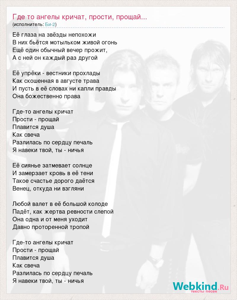 Её глаза на звёзды непохожи В них бьётся мотыльком живой огонь Ещё один обычный вечер прожит, А с ней он каждый раз другой Её упрёки - вестники прохлады Как скошенная в августе трава И пусть в её словах ни капли правды Она божественно права Где-то ангелы кричат Прости - прощай Плавится душа Как свеча Разлилась по сердцу печаль Я навеки твой, ты - ничья Её сиянье затмевает солнце И замерзает кровь в её тени Такое счастье дорого даётся Венец, откуда ни взгляни Любой валет в её большой колоде Падёт, как жертва ревности слепой Она одна и от меня уходит Давно проторенной тропой Где-то ангелы кричат Прости - прощай Плавится душа Как свеча Разлилась по сердцу печаль Я навеки твой, ты - ничья