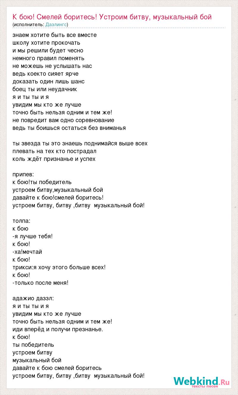 знаем хотите быть все вместе школу хотите прокочать и мы решили будет чесно немного правил поменять не можешь не услышать нас ведь коекто сияет ярче доказать один лишь шанс боец ты или неудачник я и ты ты и я увидим мы кто же лучше точно быть нельзя одним и тем же! не повредит вам одно соревнование ведь ты боишься остаться без вниманья ты звезда ты это знаешь поднимайся выше всех плевать на тех кто пострадал коль ждёт признанье и успех припев: к бою!ты победитель устроем битву,музыкальный бой давайте к бою!смелей боритесь! устроем битву, битву ,битву музыкальный бой! толпа: к бою -я лучше тебя! к бою! -ха!мечтай к бою! трикси:я хочу этого больше всех! к бою! -только после меня! адажио даззл: я и ты ты и я увидим мы кто же лучше точно быть нельзя одним и тем же! иди вперёд и получи презнанье. к бою! ты победитель устроем битву музыкальный бой давайте к бою смелей боритесь устроем битву, битву ,битву музыкальный бой!