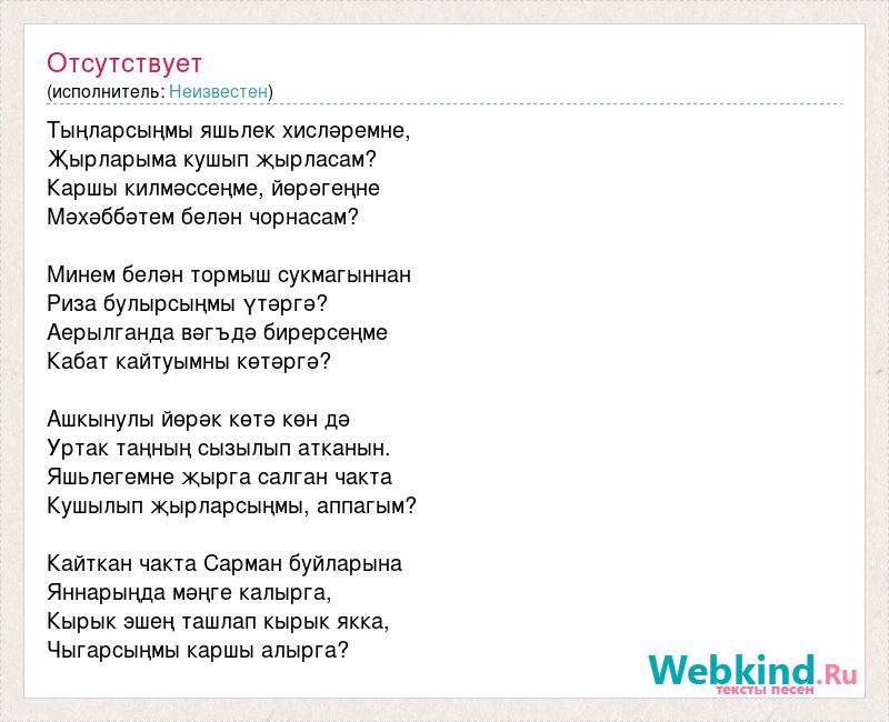 Тыңларсыңмы яшьлек хисләремне, Җырларыма кушып җырласам? Каршы килмәссеңме, йөрәгеңне Мәхәббәтем белән чорнасам? Минем белән тормыш сукмагыннан Риза булырсыңмы үтәргә? Аерылганда вәгъдә бирерсеңме Кабат кайтуымны көтәргә? Ашкынулы йөрәк көтә көн дә Уртак таңның сызылып атканын. Яшьлегемне җырга салган чакта Кушылып җырларсыңмы, аппагым? Кайткан чакта Сарман буйларына Яннарыңда мәңге калырга, Кырык эшең ташлап кырык якка, Чыгарсыңмы каршы алырга?