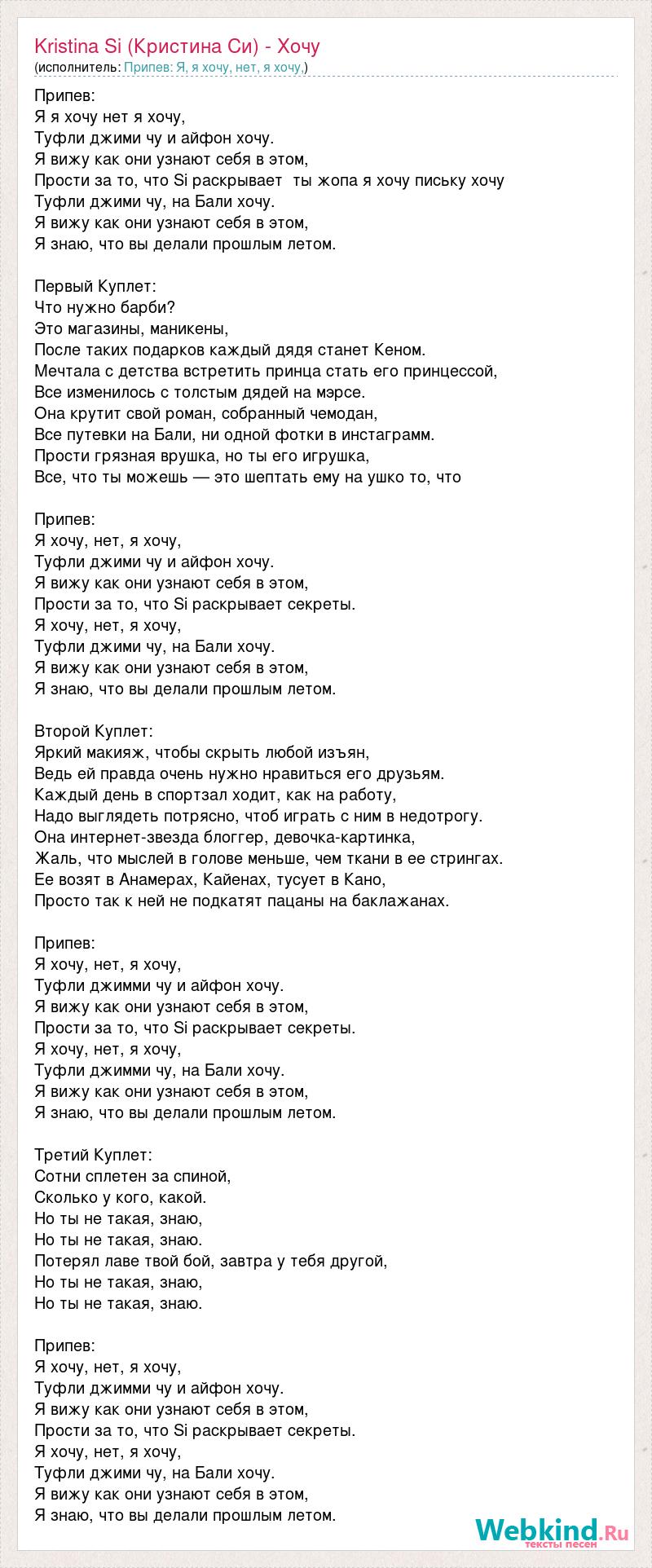 Припев: Я я хочу нет я хочу, Туфли джими чу и айфон хочу. Я вижу как они узнают себя в этом, Прости за то, что Si раскрывает ты жопа я хочу письку хочу Туфли джими чу, на Бали хочу. Я вижу как они узнают себя в этом, Я знаю, что вы делали прошлым летом. Первый Куплет: Что нужно барби? Это магазины, маникены, После таких подарков каждый дядя станет Кеном. Мечтала с детства встретить принца стать его принцессой, Все изменилось с толстым дядей на мэрсе. Она крутит свой роман, собранный чемодан, Все путевки на Бали, ни одной фотки в инстаграмм. Прости грязная врушка, но ты его игрушка, Все, что ты можешь — это шептать ему на ушко то, что Припев: Я хочу, нет, я хочу, Туфли джими чу и айфон хочу. Я вижу как они узнают себя в этом, Прости за то, что Si раскрывает секреты. Я хочу, нет, я хочу, Туфли джими чу, на Бали хочу. Я вижу как они узнают себя в этом, Я знаю, что вы делали прошлым летом. Второй Куплет: Яркий макияж, чтобы скрыть любой изъян, Ведь ей правда очень нужно нравиться его друзьям. Каждый день в спортзал ходит, как на работу, Надо выглядеть потрясно, чтоб играть с ним в недотрогу. Она интернет-звезда блоггер, девочка-картинка, Жаль, что мыслей в голове меньше, чем ткани в ее стрингах. Ее возят в Анамерах, Кайенах, тусует в Кано, Просто так к ней не подкатят пацаны на баклажанах. Припев: Я хочу, нет, я хочу, Туфли джимми чу и айфон хочу. Я вижу как они узнают себя в этом, Прости за то, что Si раскрывает секреты. Я хочу, нет, я хочу, Туфли джимми чу, на Бали хочу. Я вижу как они узнают себя в этом, Я знаю, что вы делали прошлым летом. Третий Куплет: Сотни сплетен за спиной, Сколько у кого, какой. Но ты не такая, знаю, Но ты не такая, знаю. Потерял лаве твой бой, завтра у тебя другой, Но ты не такая, знаю, Но ты не такая, знаю. Припев: Я хочу, нет, я хочу, Туфли джимми чу и айфон хочу. Я вижу как они узнают себя в этом, Прости за то, что Si раскрывает секреты. Я хочу, нет, я хочу, Туфли джими чу, на Бали хочу. Я вижу как они узнают себя в этом, Я знаю, что вы делали прошлым летом.
