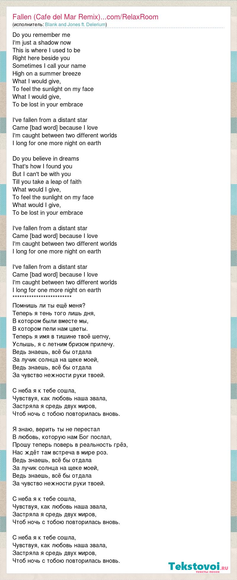 Do you remember me I'm just a shadow now This is where I used to be Right here beside you Sometimes I call your name High on a summer breeze What I would give, To feel the sunlight on my face What I would give, To be lost in your embrace I've fallen from a distant star Came back, compelled because I love I'm caught between two different worlds I long for one more night on earth Do you believe in dreams That's how I found you But I can't be with you Till you take a leap of faith What would I give, To feel the sunlight on my face What would I give, To be lost in your embrace I've fallen from a distant star Came back, compelled because I love I'm caught between two different worlds I long for one more night on earth I've fallen from a distant star Came back, compelled because I love I'm caught between two different worlds I long for one more night on earth ************************* Помнишь ли ты ещё меня? Теперь я тень того лишь дня, В котором были вместе мы, В котором пели нам цветы. Теперь я имя в тишине твоё шепчу, Услышь, я с летним бризом прилечу. Ведь знаешь, всё бы отдала За лучик солнца на щеке моей, Ведь знаешь, всё бы отдала За чувство нежности руки твоей. С неба я к тебе сошла, Чувствуя, как любовь наша звала, Застряла я средь двух миров, Чтоб ночь с тобою повторилась вновь. Я знаю, верить ты не перестал В любовь, которую нам Бог послал, Прошу теперь поверь в реальность грёз, Нас ждёт там встреча в мире роз. Ведь знаешь, всё бы отдала За лучик солнца на щеке моей, Ведь знаешь, всё бы отдала За чувство нежности руки твоей. С неба я к тебе сошла, Чувствуя, как любовь наша звала, Застряла я средь двух миров, Чтоб ночь с тобою повторилась вновь. С неба я к тебе сошла, Чувствуя, как любовь наша звала, Застряла я средь двух миров, Чтоб ночь с тобою повторилась вновь.