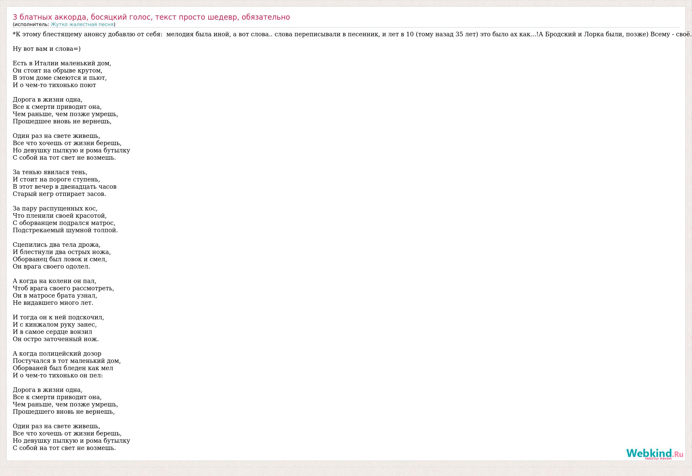 *К этому блестящему анонсу добавлю от себя: мелодия была иной, а вот слова.. слова переписывали в песенник, и лет в 10 (тому назад 35 лет) это было ах как...!А Бродский и Лорка были, позже) Всему - своё. Ну вот вам и слова=) Есть в Италии маленький дом, Он стоит на обрыве крутом, В этом доме смеются и пьют, И о чем-то тихонько поют Дорога в жизни одна, Все к смерти приводит она, Чем раньше, чем позже умрешь, Прошедшее вновь не вернешь, Один раз на свете живешь, Все что хочешь от жизни берешь, Но девушку пылкую и рома бутылку С собой на тот свет не возмешь. За тенью явилася тень, И стоит на пороге ступень, В этот вечер в двенадцать часов Старый негр отпирает засов. За пару распущенных кос, Что пленили своей красотой, С оборванцем подрался матрос, Подстрекаемый шумной толпой. Сцепились два тела дрожа, И блестнули два острых ножа, Оборванец был ловок и смел, Он врага своего одолел. А когда на колени он пал, Чтоб врага своего рассмотреть, Он в матросе брата узнал, Не видавшего много лет. И тогда он к ней подскочил, И с кинжалом руку занес, И в самое сердце вонзил Он остро заточенный нож. А когда полицейский дозор Постучался в тот маленький дом, Оборваней был бледен как мел И о чем-то тихонько он пел: Дорога в жизни одна, Все к смерти приводит она, Чем раньше, чем позже умрешь, Прошедшего вновь не вернешь, Один раз на свете живешь, Все что хочешь от жизни берешь, Но девушку пылкую и рома бутылку С собой на тот свет не возмешь.