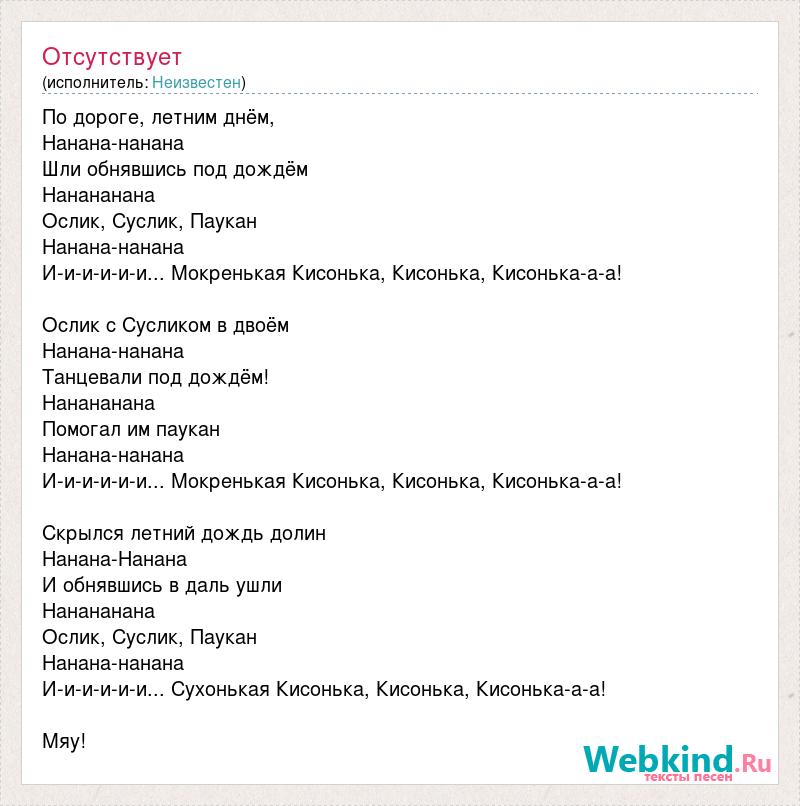 По дороге, летним днём, Нанана-нанана Шли обнявшись под дождём Нанананана Ослик, Суслик, Паукан Нанана-нанана И-и-и-и-и-и... Мокренькая Кисонька, Кисонька, Кисонька-а-а! Ослик с Сусликом в двоём Нанана-нанана Танцевали под дождём! Нанананана Помогал им паукан Нанана-нанана И-и-и-и-и-и... Мокренькая Кисонька, Кисонька, Кисонька-а-а! Скрылся летний дождь долин Нанана-Нанана И обнявшись в даль ушли Нанананана Ослик, Суслик, Паукан Нанана-нанана И-и-и-и-и-и... Сухонькая Кисонька, Кисонька, Кисонька-а-а! Мяу!