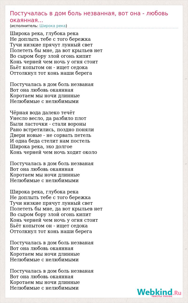 Широка река, глубока река Не доплыть тебе с того бережка Тучи низкие прячут лунный свет Полететь бы мне, да вот крыльев нет Во сыром бору злой огонь кипит Конь черней чем ночь у огня стоит Бьёт копытом он - ищет седока Оттолкнул тот конь наши берега Постучалась в дом боль незваная Вот она любовь окаянная Коротаем мы ночи длинные Нелюбимые с нелюбимыми Чёрная вода далеко течёт Унесло весло, да разбило плот Были ласточки - стали вороны Рано встретились, поздно поняли Двери новые - не сорвать петель И одна беда стелит нам постель Широка река, эхо долгое Конь черней чем ночь ходит около Постучалась в дом боль незваная Вот она любовь окаянная Коротаем мы ночи длинные Нелюбимые с нелюбимыми Широка река, глубока река Не доплыть тебе с того бережка Тучи низкие прячут лунный свет Полететь бы мне, да вот крыльев нет Во сыром бору злой огонь кипит Конь черней чем ночь у огня стоит Бьёт копытом он - ищет седока Оттолкнул тот конь наши берега Постучалась в дом боль незваная Вот она любовь окаянная Коротаем мы ночи длинные Нелюбимые с нелюбимыми Постучалась в дом боль незваная Вот она любовь окаянная Коротаем мы ночи длинные Нелюбимые с нелюбимыми