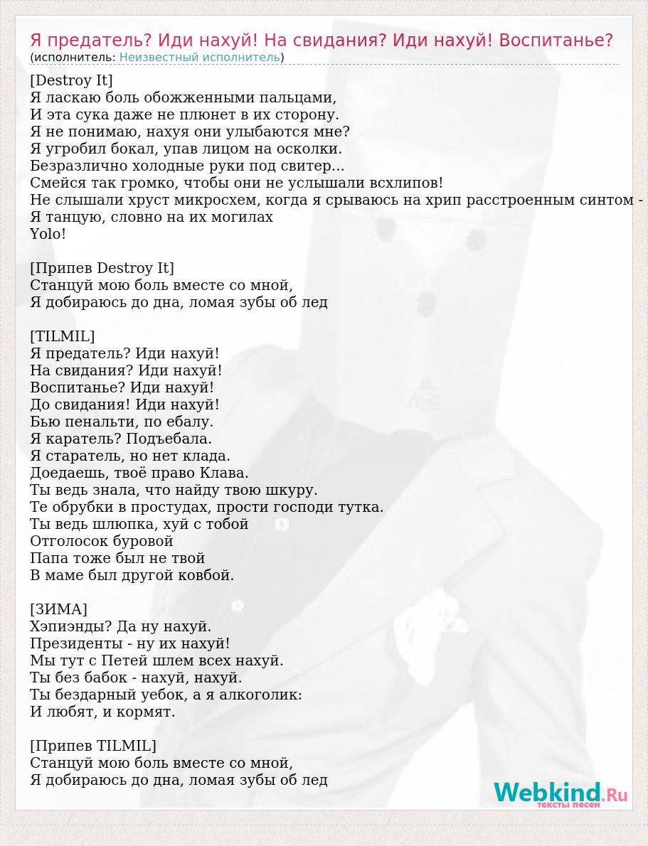 [Destroy It] Я ласкаю боль обожженными пальцами, И эта сука даже не плюнет в их сторону. Я не понимаю, нахуя они улыбаются мне? Я угробил бокал, упав лицом на осколки. Безразлично холодные руки под свитер... Смейся так громко, чтобы они не услышали всхлипов! Не слышали хруст микросхем, когда я срываюсь на хрип расстроенным синтом - Я танцую, словно на их могилах Yolo! [Припев Destroy It] Станцуй мою боль вместе со мной, Я добираюсь до дна, ломая зубы об лед [TILMIL] Я предатель? Иди нахуй! На свидания? Иди нахуй! Воспитанье? Иди нахуй! До свидания! Иди нахуй! Бью пенальти, по ебалу. Я каратель? Подъебала. Я старатель, но нет клада. Доедаешь, твоё право Клава. Ты ведь знала, что найду твою шкуру. Те обрубки в простудах, прости господи тутка. Ты ведь шлюпка, хуй с тобой Отголосок буровой Папа тоже был не твой В маме был другой ковбой. [ЗИМА] Хэпиэнды? Да ну нахуй. Президенты - ну их нахуй! Мы тут с Петей шлем всех нахуй. Ты без бабок - нахуй, нахуй. Ты бездарный уебок, а я алкоголик: И любят, и кормят. [Припев TILMIL] Станцуй мою боль вместе со мной, Я добираюсь до дна, ломая зубы об лед