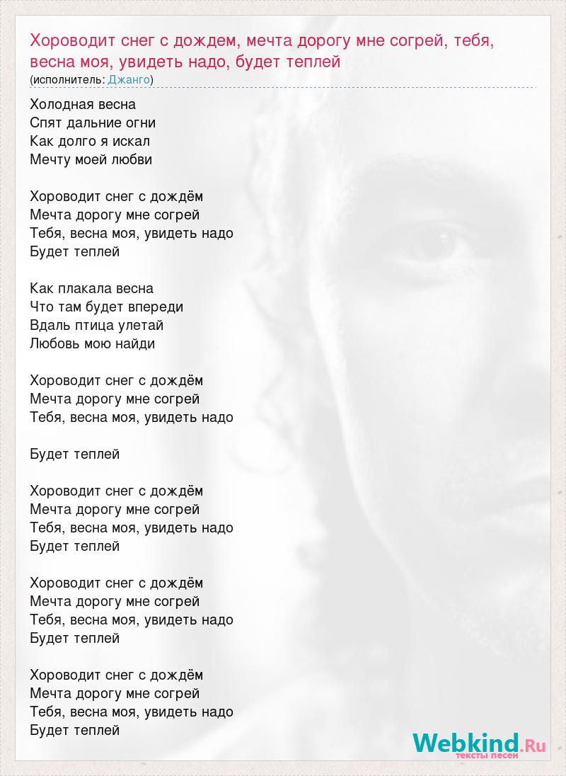 Холодная весна Спят дальние огни Как долго я искал Мечту моей любви Хороводит снег с дождём Мечта дорогу мне согрей Тебя, весна моя, увидеть надо Будет теплей Как плакала весна Что там будет впереди Вдаль птица улетай Любовь мою найди Хороводит снег с дождём Мечта дорогу мне согрей Тебя, весна моя, увидеть надо Будет теплей Хороводит снег с дождём Мечта дорогу мне согрей Тебя, весна моя, увидеть надо Будет теплей Хороводит снег с дождём Мечта дорогу мне согрей Тебя, весна моя, увидеть надо Будет теплей Хороводит снег с дождём Мечта дорогу мне согрей Тебя, весна моя, увидеть надо Будет теплей